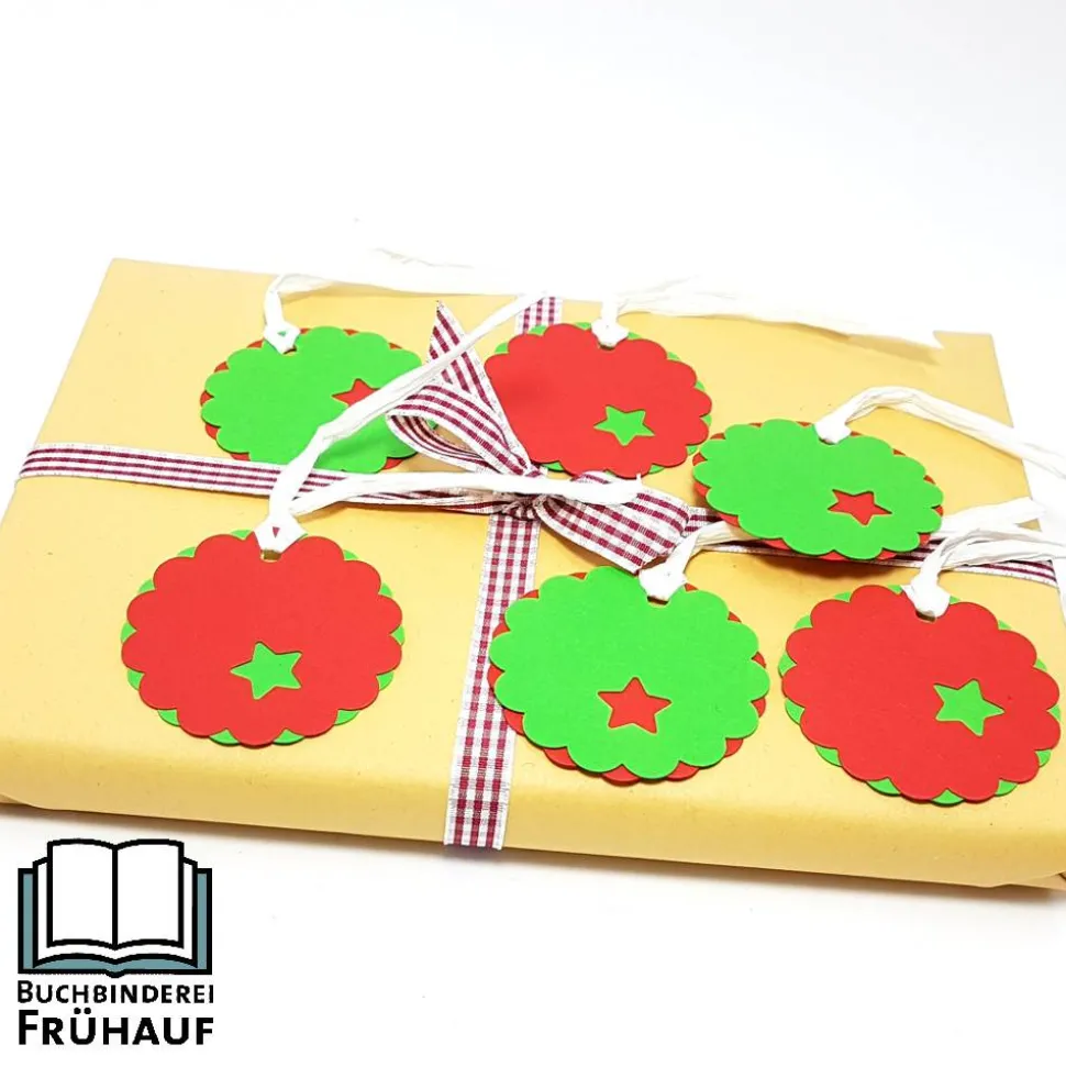 6 runde Geschenkanhänger mit Wellenrand. Jeder Anhänger besteht aus 2 Kreisen mit Wellenrand,Durchmesser ca. 5cm.Im vorderen Kreis ist ein Stern ausgestanzt, der hintere Kreis ist ohne ausgestanzten Stern.