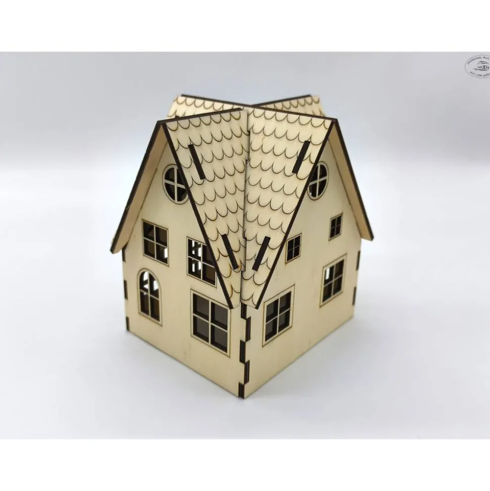 Dieses liebevoll gestaltete Weihnachtshaus aus Pappelsperrholz ist ein Bastelset für Groß und Klein mit filigranen Details.
