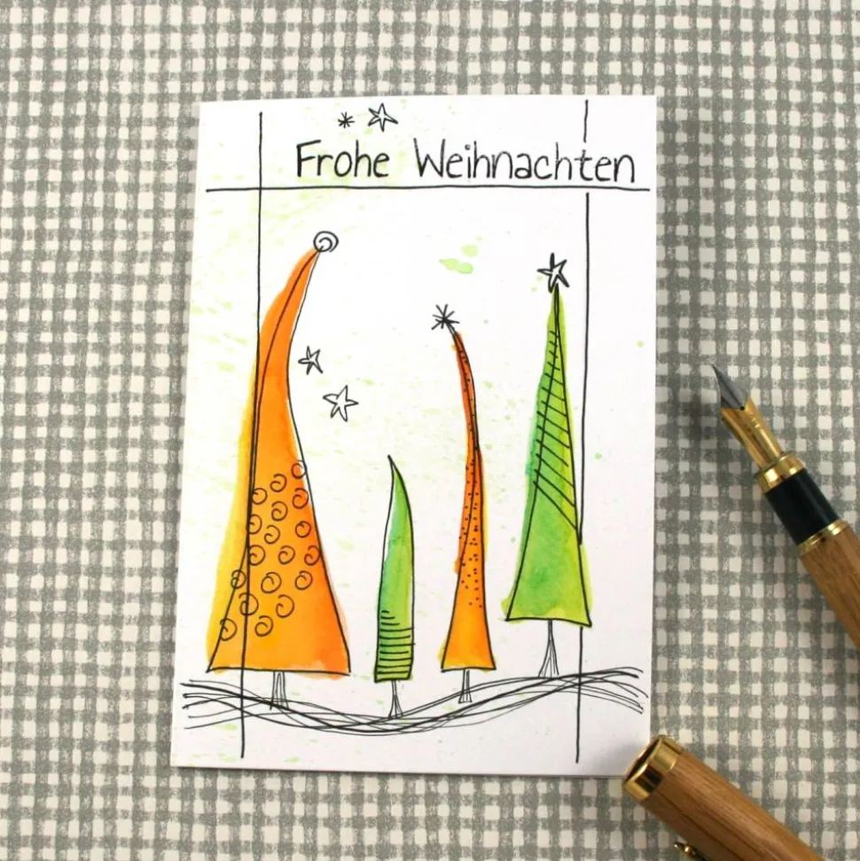 Klappkarte mit Umschlag – Kolorierte Zeichnung mit weihnachtlichem Motiv – garantiertes Einzelstück Bäume3 (Art.Nr. A-317) – Bunte Weihnachtsbäume, schlicht & farbstark!