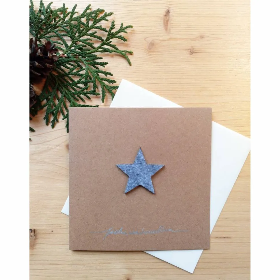 Jede Karte ist mit viel Liebe handgefertigt und unterscheidet sich leicht. Die Farbe des Sterns (rot, gelb, weiß, grau-meliert) können Sie wählen. Der gelbe Stern ist etwas kleiner als die andersfarbigen. Die Fotos zeigen Beispiele.