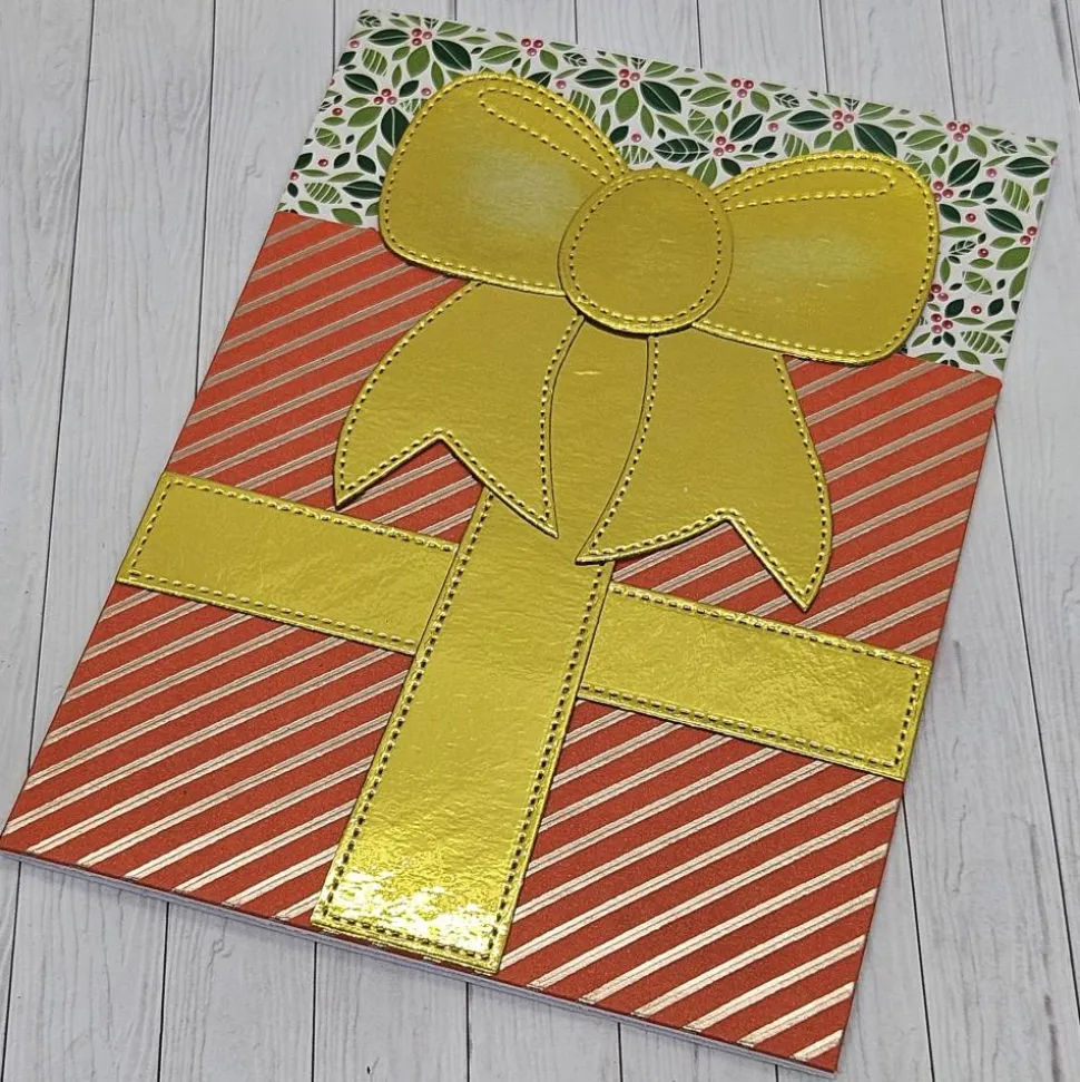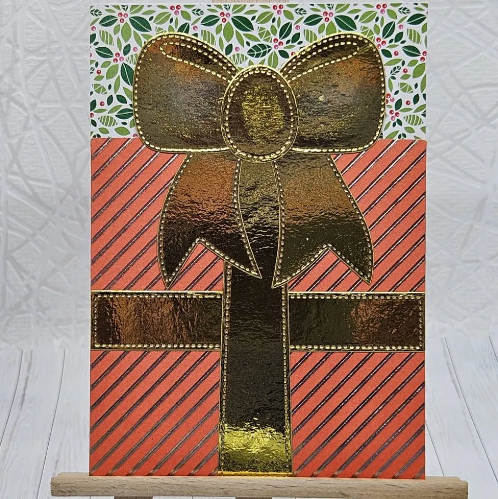 Diese handgefertigte Weihnachtskarte vereint festliche Eleganz mit moderner Farbgestaltung und wird so zu einem ganz besonderen Highlight unter dem Weihnachtsbaum. Die Vorderseite zeigt ein stilisiertes Geschenk in kräftigem Korallrot, veredelt mit fein schimmernden goldenen Streifen, die der Karte einen luxuriösen und warmen Ausdruck verleihen. Abgerundet wird das Design durch eine große, goldglänzende Schleife, die das Geschenkmotiv komplett macht und den festlichen Charakter der Karte unterstreicht.