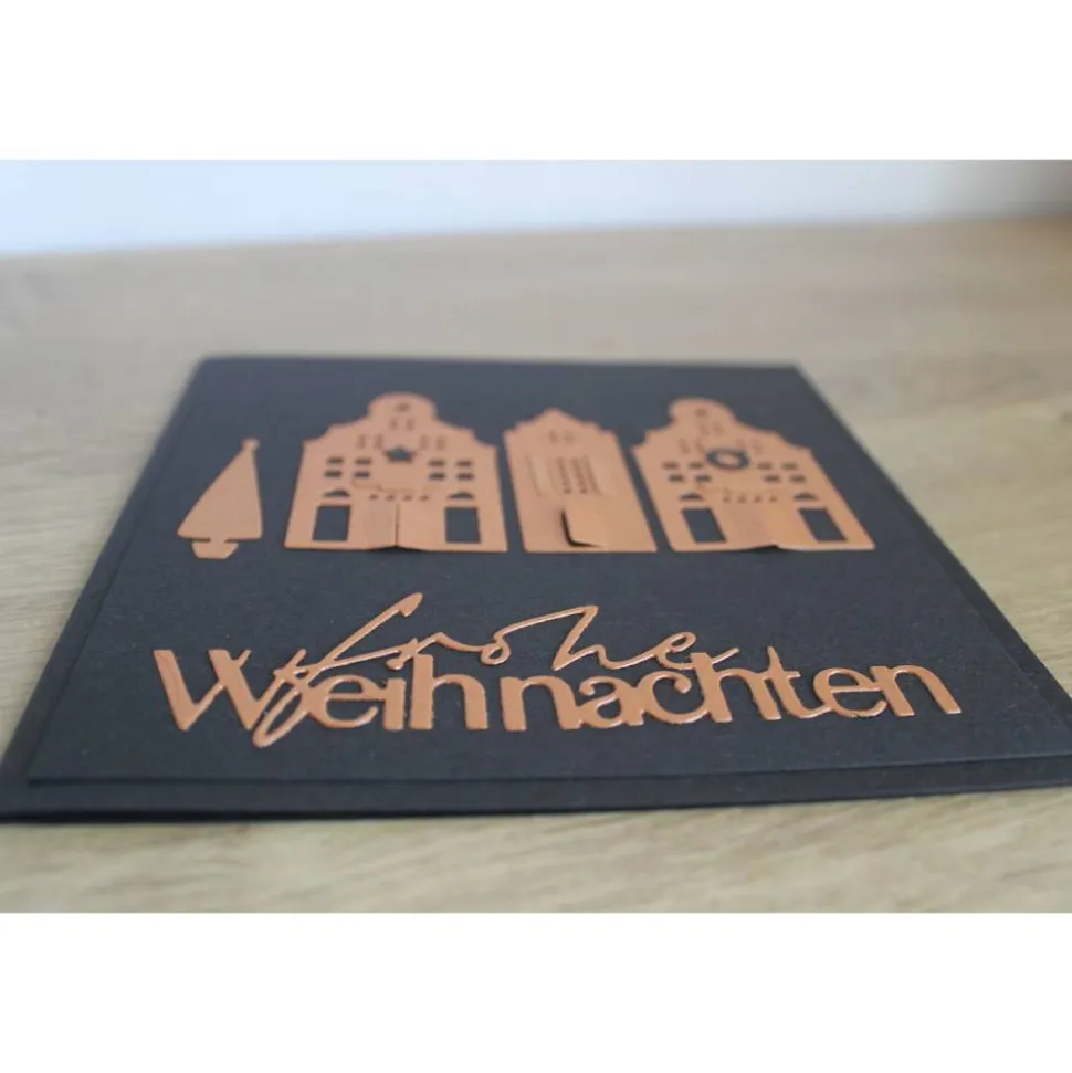 Die quadratische, schwarze Grußkarte ist mit kupfer-schimmernden, gestanzten Grachtenhäuser im weihnachtlichen Look und dem Schriftzug „frohe Weihnachten“ verziert. Kleine Details, wie die leicht geöffneten Türen und die aufgebrachten Fensterläden und Giebel machen die Weihnachtskarte sehr edel.