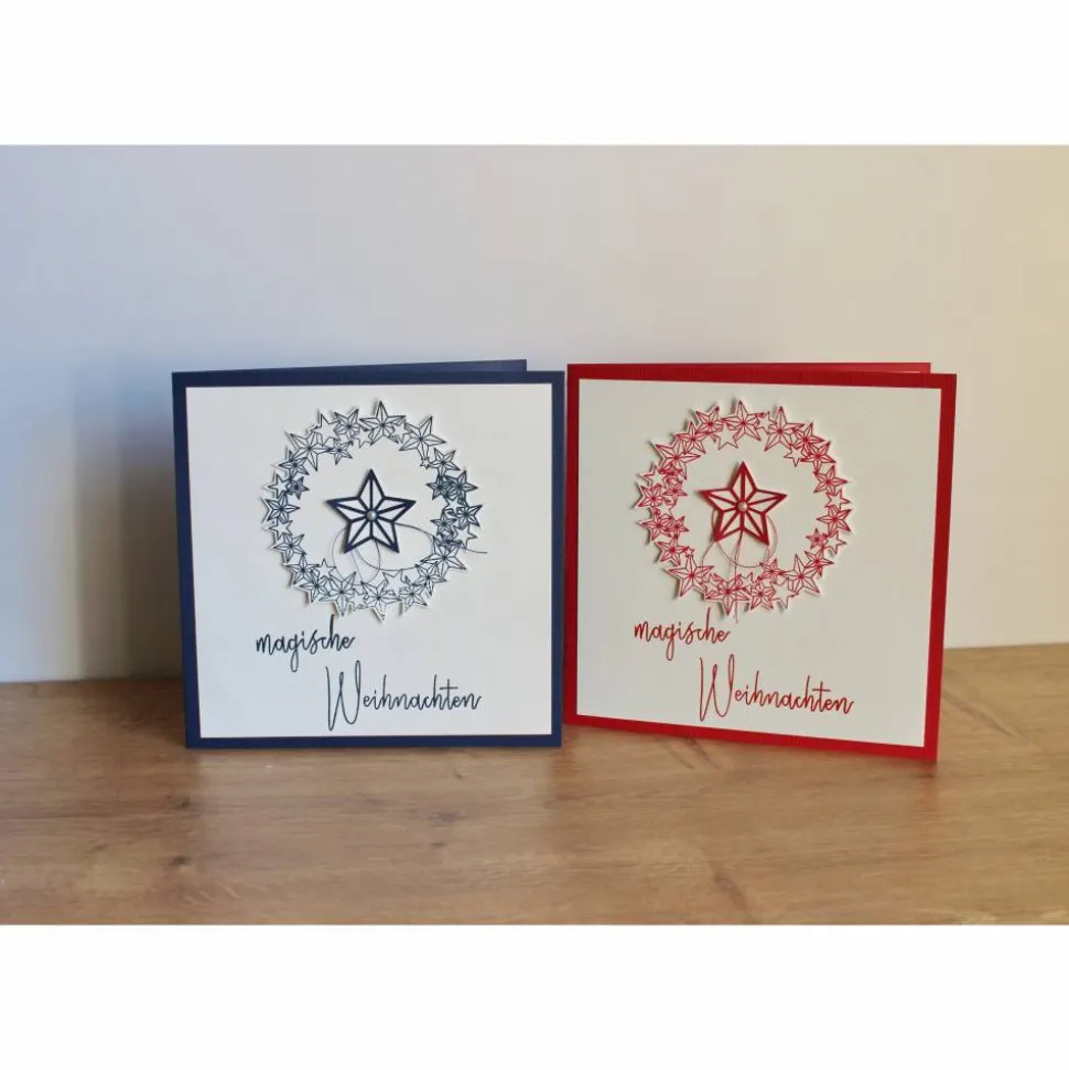 Die Karte gibt es wahlweise in dunkelblau oder himbeerrot.