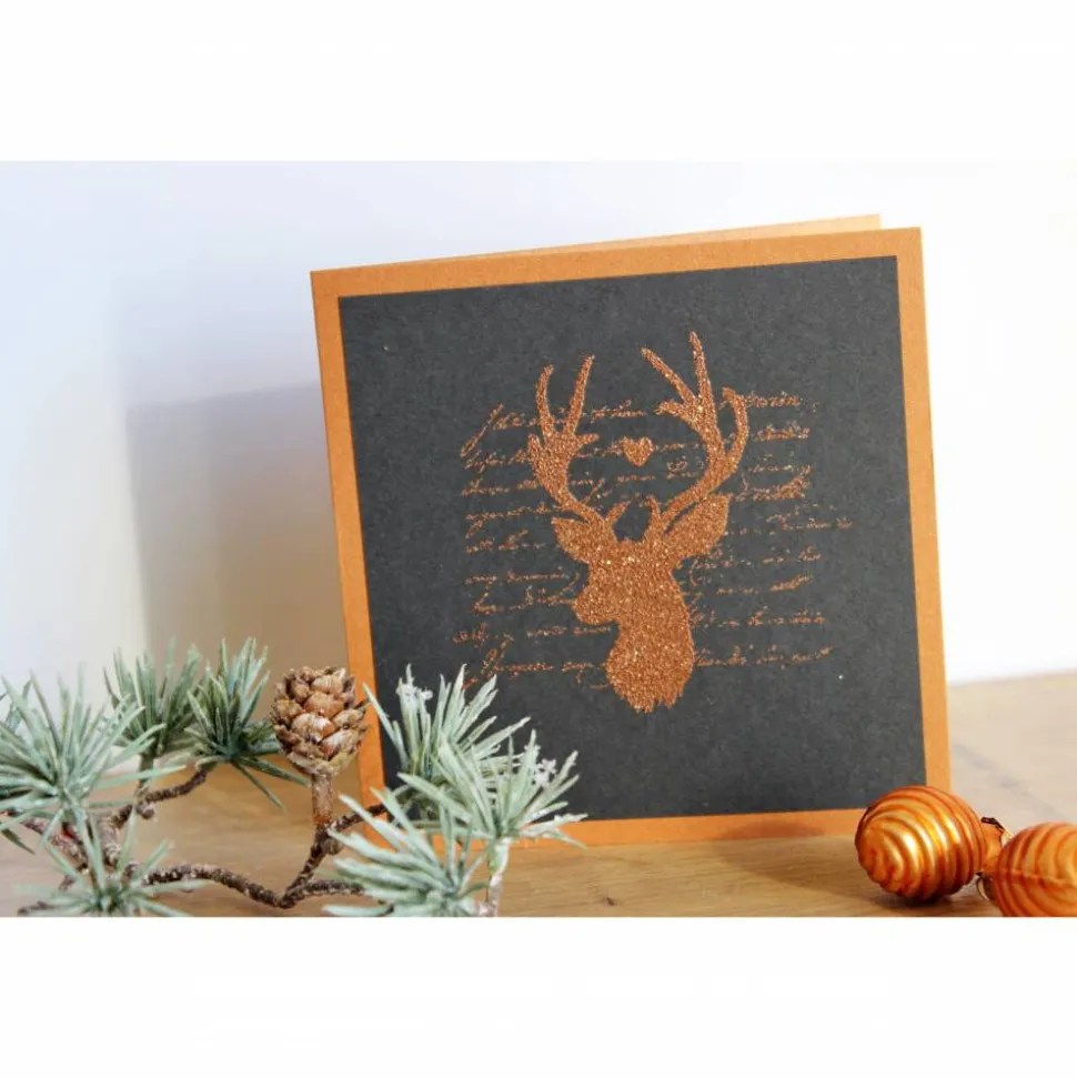 Der bronzefarbene Karton der Karte hat einen leicht schimmernden Effekt, was durch das glitzernde der Vorderseite auf dem schwarzen Untergrund noch hervorgehoben wird.