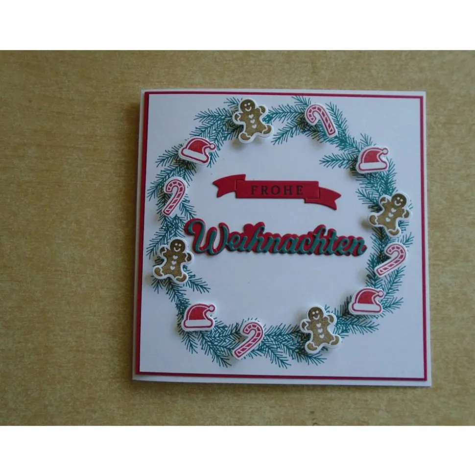 Hier seht ihr eine schöne Weihnachtskarte mit Weihnachtskranz und süssen Lebkuchenmann Zuckerstange und Weihnachtsmütze……