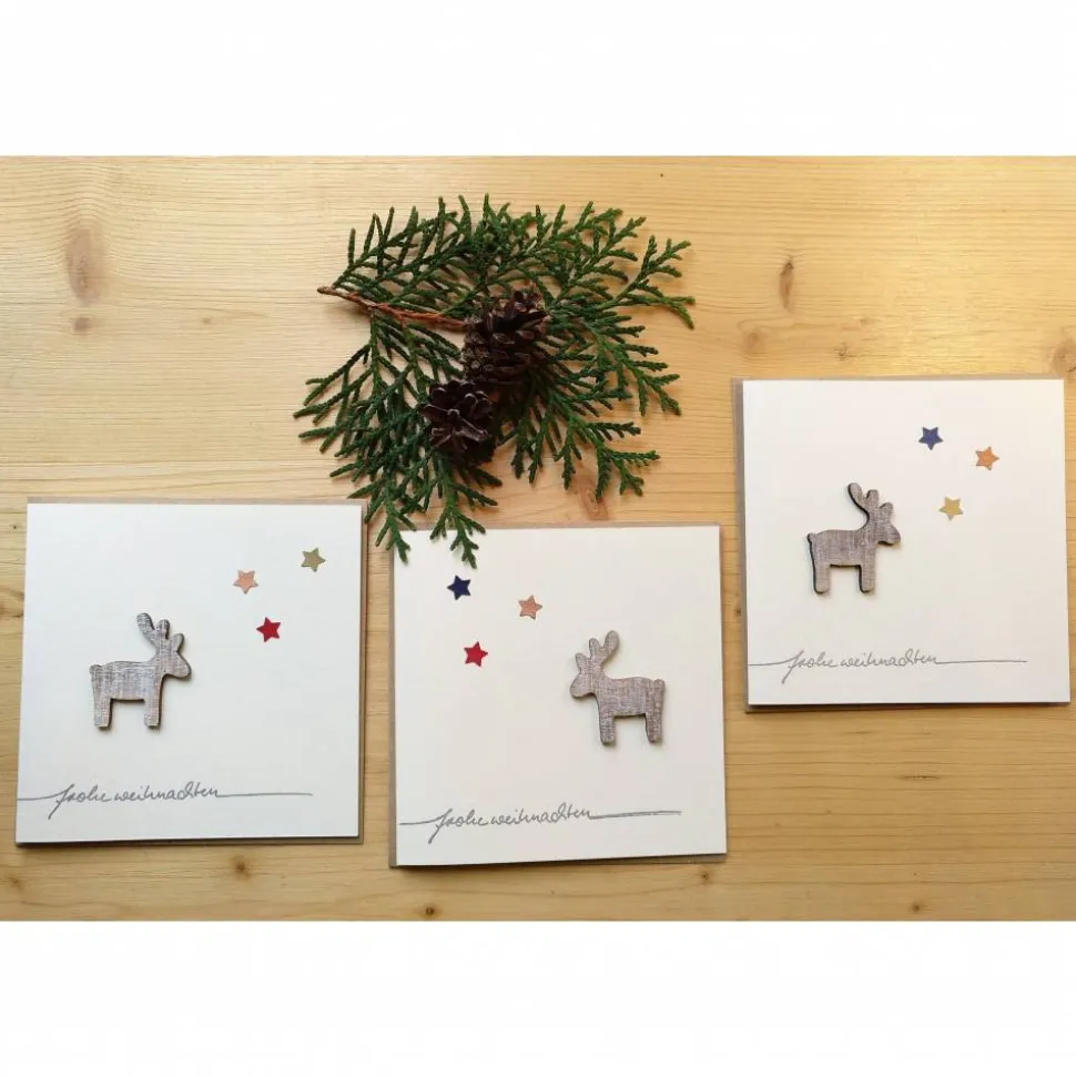 Jede Karte ist mit viel Liebe handgefertigt und unterscheidet sich leicht, u.a. in der Position des Rentiers und Farbe und Position der Sterne. Die Fotos zeigen Beispiele. Die Auswahl erfolgt zufällig, Sie können aber ihre Wünsche per Nachricht an mich senden.