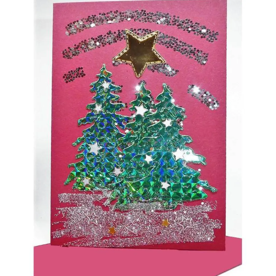 Diese liebevoll gestaltete Karte in festlichem Rot ist mit grünen Tannenbäumen, goldfarbenen und silberfarbenen Sternen sowie silberfarbenem Glitzer dekoriert. Jede Karte ist ein Unikat und ein echter Blickfang.