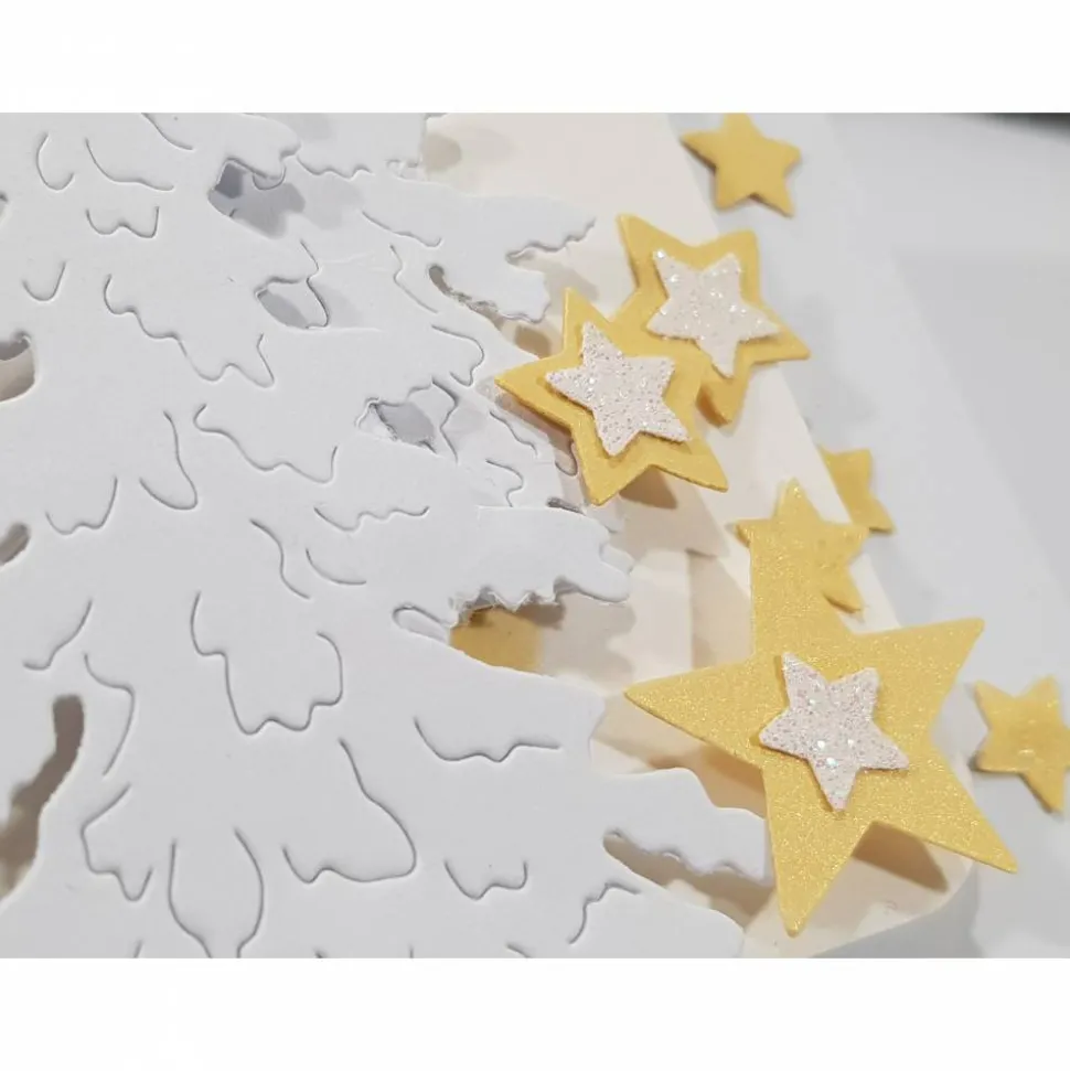 Auf zwei weißenTannen auf der rechten Seite glitzern Sterne , genauso wieSternchen und Engelchen auf der Kugel glitzern.