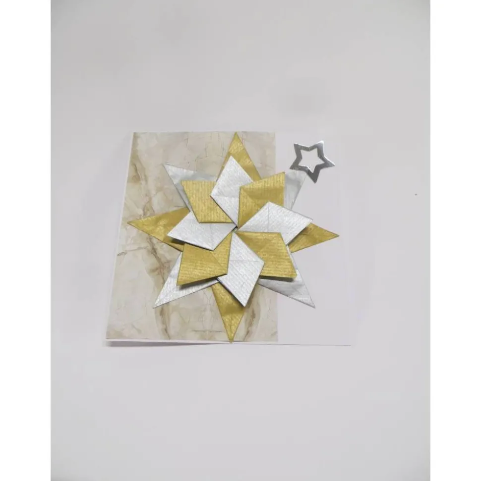 Eine Weihnachtskarte, Grußkarte Weihnachten zu mit einem großen handgearbeiteten Stern in 3d Design. Weihnachtsgrüße mit einem großen Weihnachtsstern in gold und silber. So ist auch ein Geldgeschenk oder ein Gutschein zu Weihnachten hübsch verpackt. Ideal auch als Geburtstagskarte für diejenigen, die in der Weihnachtszeit Geburtstag haben.