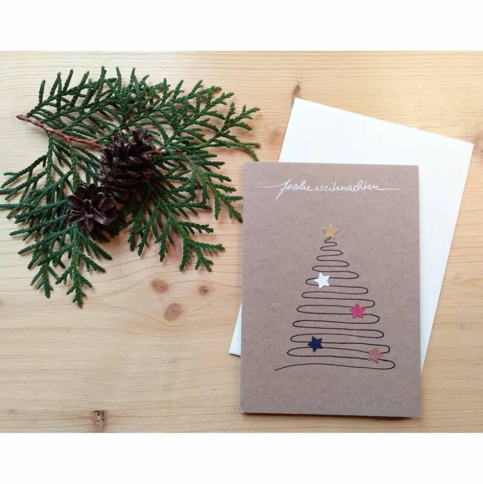 Jede Karte ist mit viel Liebe handgefertigt und unterscheidet sich leicht, u.a. in der Baumform und der Farbe der Sterne. Die Fotos zeigen Beispiele. Die Auswahl erfolgt zufällig, Sie können aber ihre Wünsche per Nachricht an mich senden.