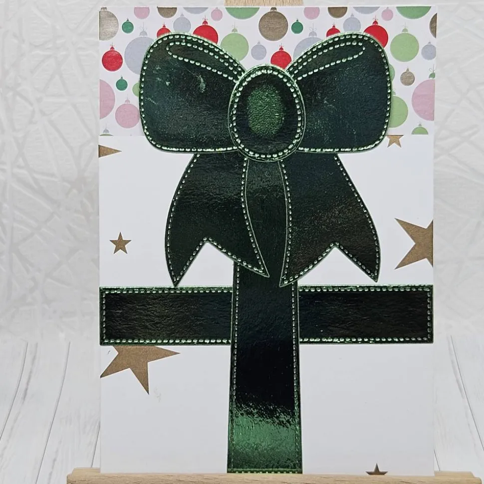 Diese handgefertigte Weihnachtskarte verbindet klare, moderne Gestaltung mit einem fröhlich-festlichen Farbakzent und wird so zu einer besonders liebevollen Art, Weihnachtsgrüße oder Gutscheine zu überreichen. Das Motiv zeigt ein großes Geschenk auf weißem Hintergrund, wodurch die Farben besonders klar zur Geltung kommen. Die Schleife sowie das umlaufende Geschenkband bestehen aus glänzendem Metallic-Grün, das das Licht wunderschön reflektiert und sofort eine weihnachtliche Atmosphäre entstehen lässt.