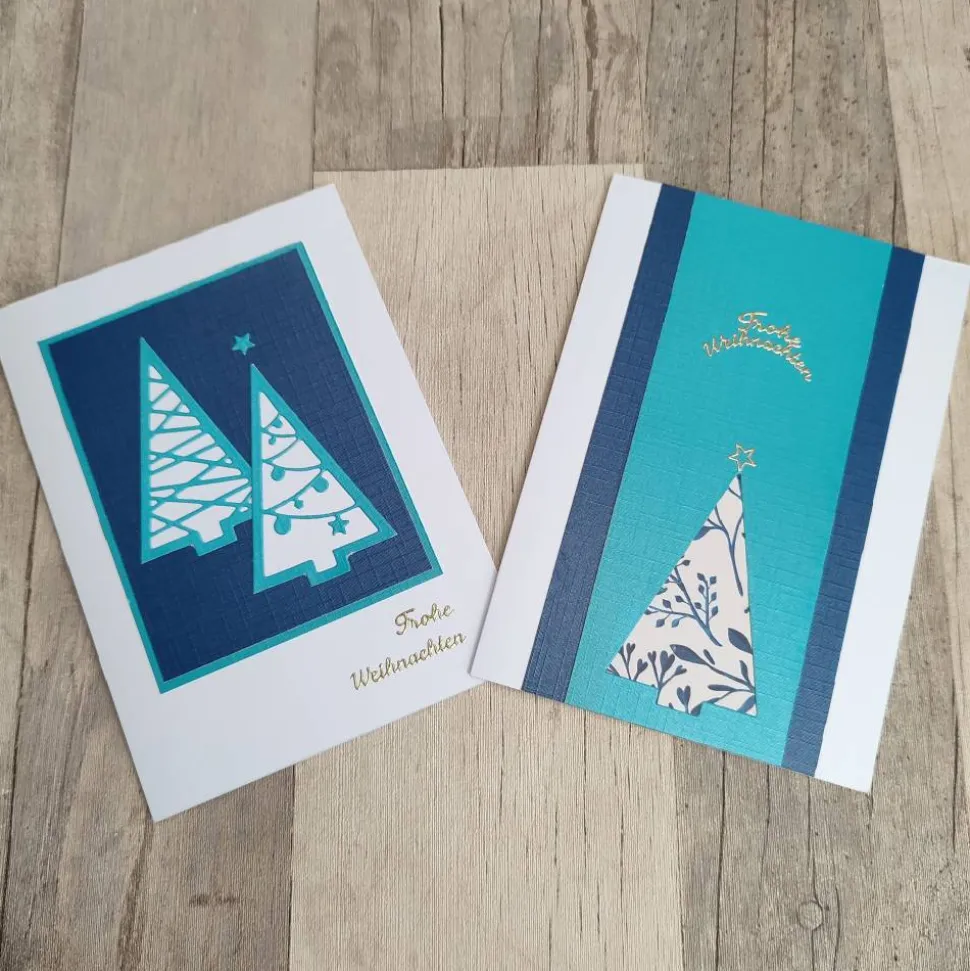 Die Grundkarte besteht aus weißem Papier der Stärke 250g/m2. Dieses habe ich mit blauem Papier in Leinenoptik dekoriert. Auf Karte Nr. 1 habe ich zwei gestanzte Tannenbäume auf weißem Hintergrund geklebt, aus Karte zwei hab ich den Tannenbaum ins Papier gestanzt. Ein goldfarbene Sticker mit dem Spruch „Frohe Weihnachten“ runden die Karte ab.