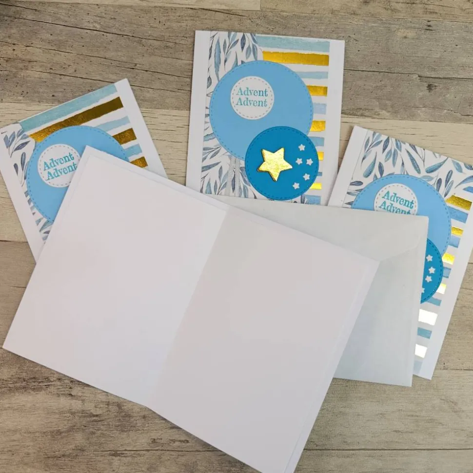 Individuell gestaltete Grußkarten, gehalten in harmonischen Blau-, Gold- und Weißtönen mit dezentem winterlichen Blattmuster. Jede Karte trägt einen großen Kreis mit dem von mir gestempelten Schriftzug „Advent Advent“ sowie einen kleineren Kreis, verziert mit einem goldenen Holzstern und kleinen ausgestanzten Sternen – ein warmer, natürlicher Blickfang.