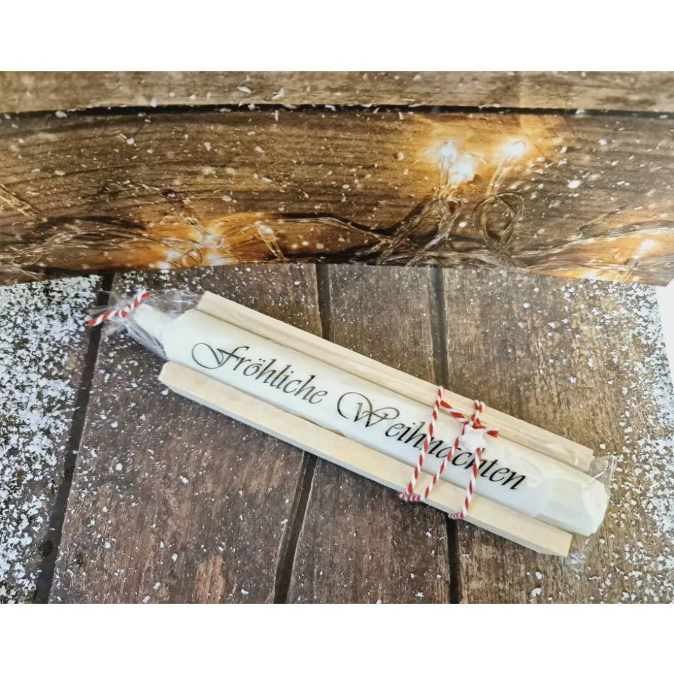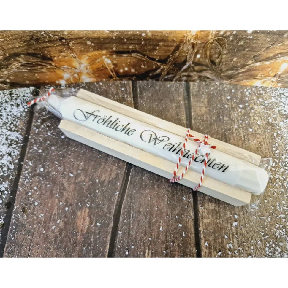 Die hochwertige Stabkerze in weiß misst 18 cm und hat eine Brenndauer von ca. 6 Stunden. Sie ist mit einer besonderen Kerzenfolie mit der Aufschrift „fröhliche Weihnachten“ verschönert. Das Set beinhaltet außerdem eine dekorative Holzbox, eine rot-weiße Kordel und einen weißen Dekostern.