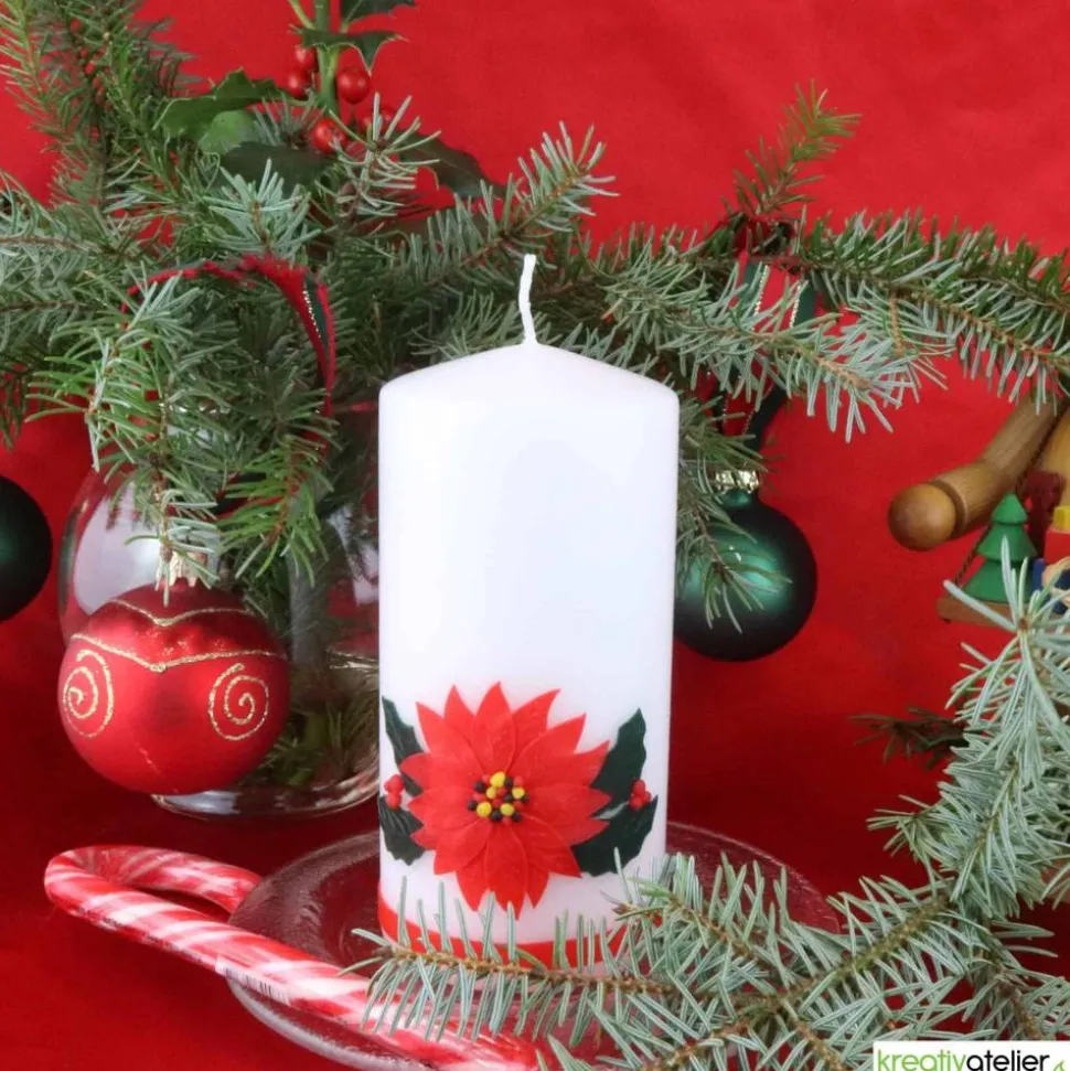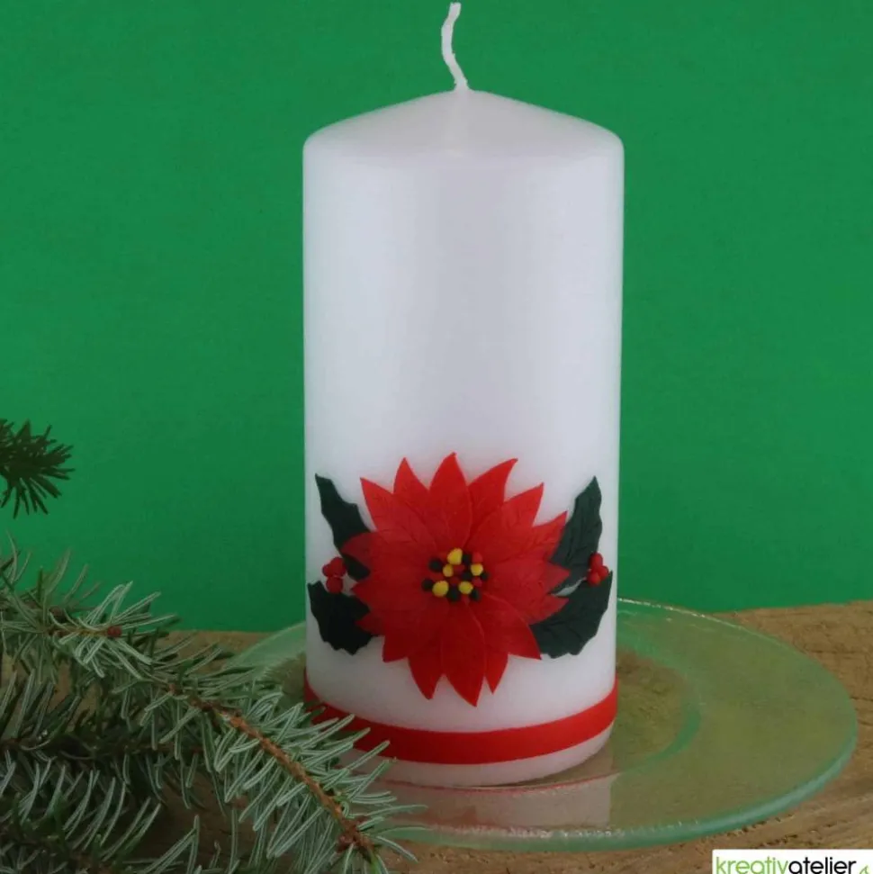 Diese weiße Weihnachtskerze ist mit einem strahlend roten Weihnachtsstern und dunkelgrünen Ilexblättern verziert. Die detailreichen Motive aus Wachs wurden sorgfältig von Hand gefertigt und sorgen für ein harmonisches, festliches Gesamtbild. Diese Kerze bringt die Weihnachtsstimmung auf stimmungsvolle Weise in Ihr Zuhause.
