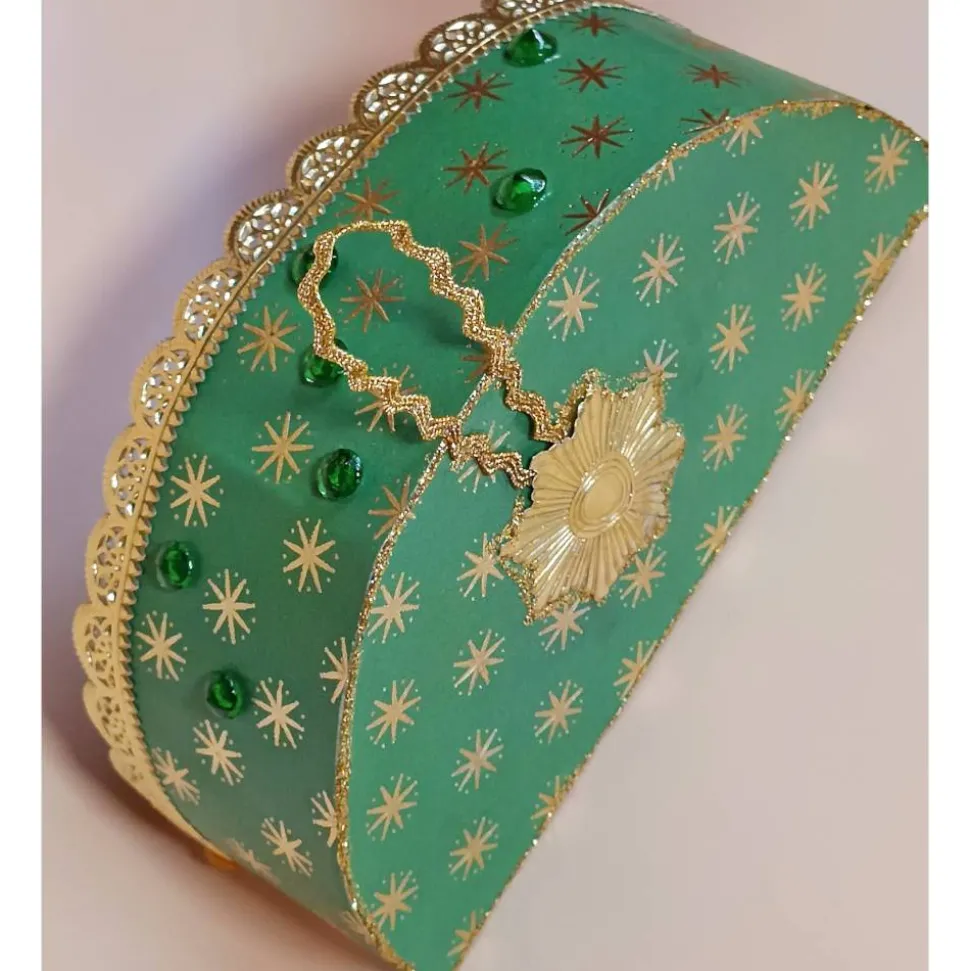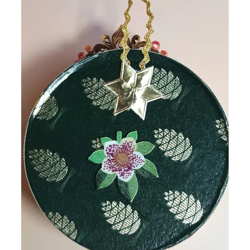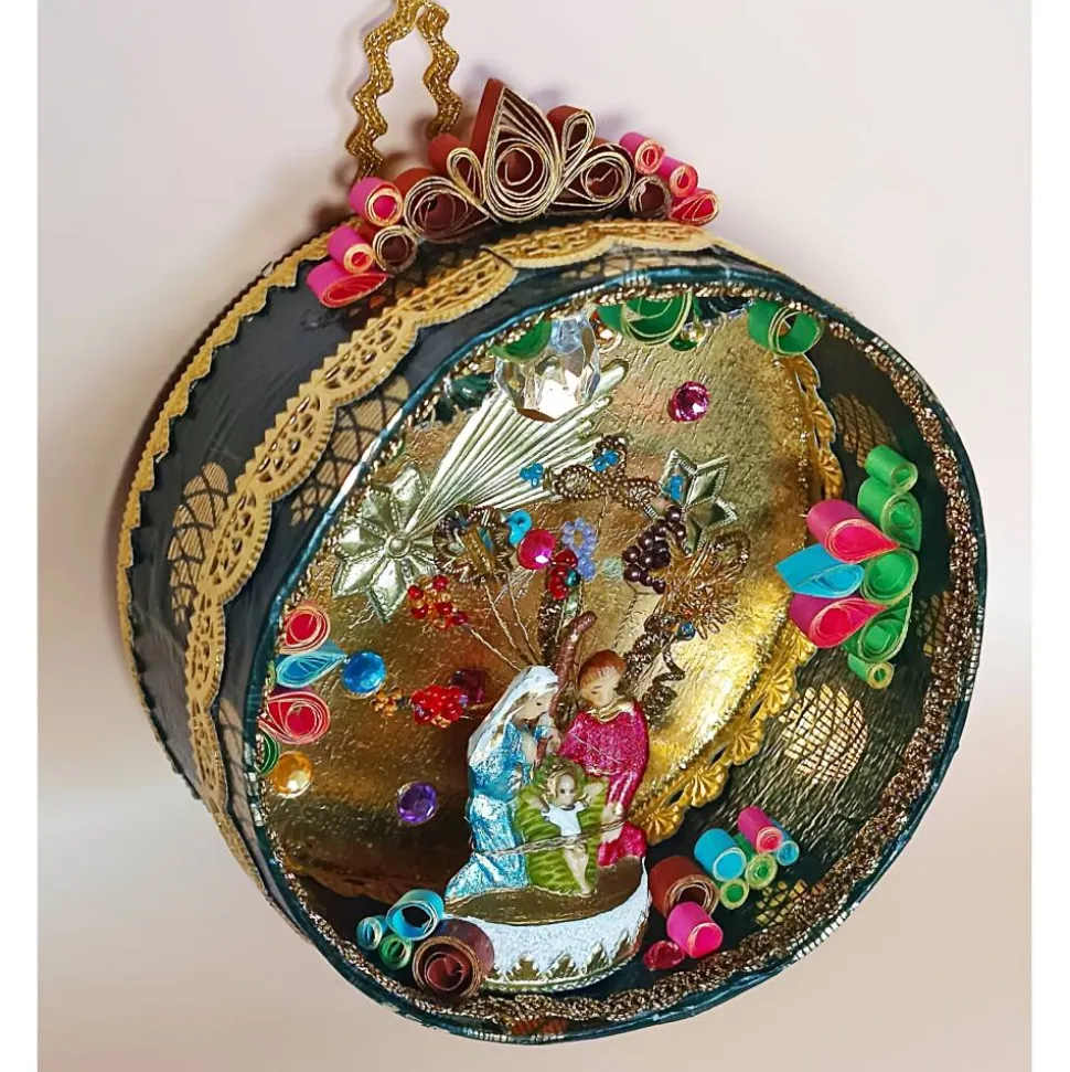 Aufwendig verziert mit goldenen Papier-Borten aus Dresdner Pappe, farbigen Schmucksteinen, bunten Quilling-Ornamenten und Perlen-Blümchen aus vergoldetem Bouillondraht, wird dieses Schmuckstück zum Blickfang an Deinem Tannenbaum oder an der Wand. Die kleine goldfarbene Schlaufe aus Zackenborte macht das Aufhängen besonders einfach und sieht dazu noch hübsch aus.