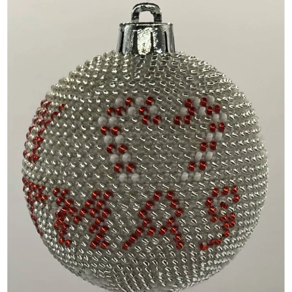 Es werden Kunststoff Weihnachtskugeln mit aufgefädelten Glasperlen umhäkelt.