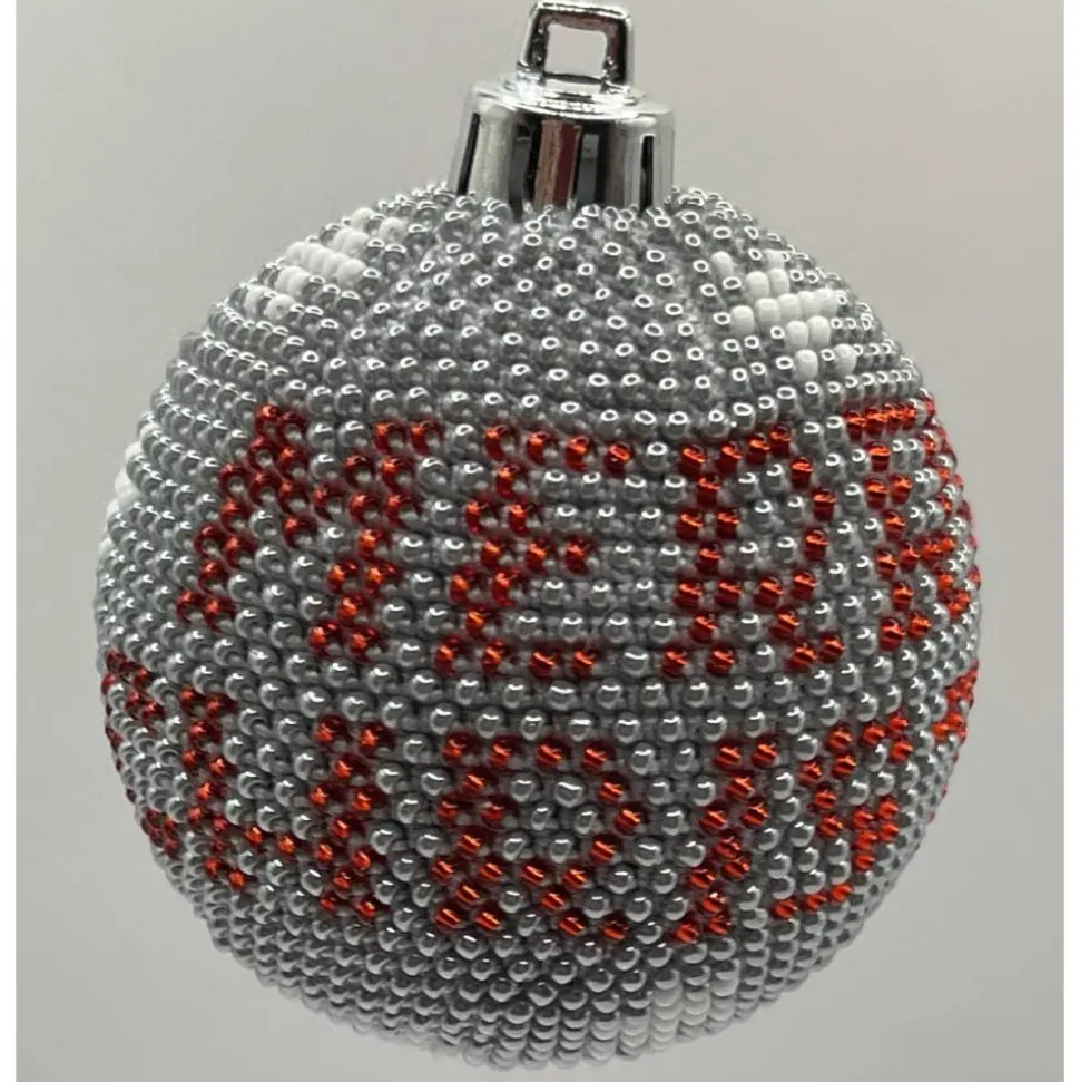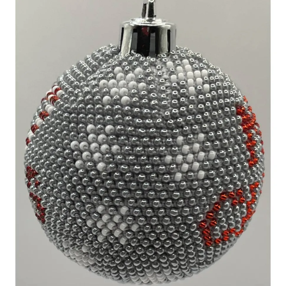 Es werden Kunststoff Weihnachtskugeln mit aufgefädelten Glasperlen umhäkelt.