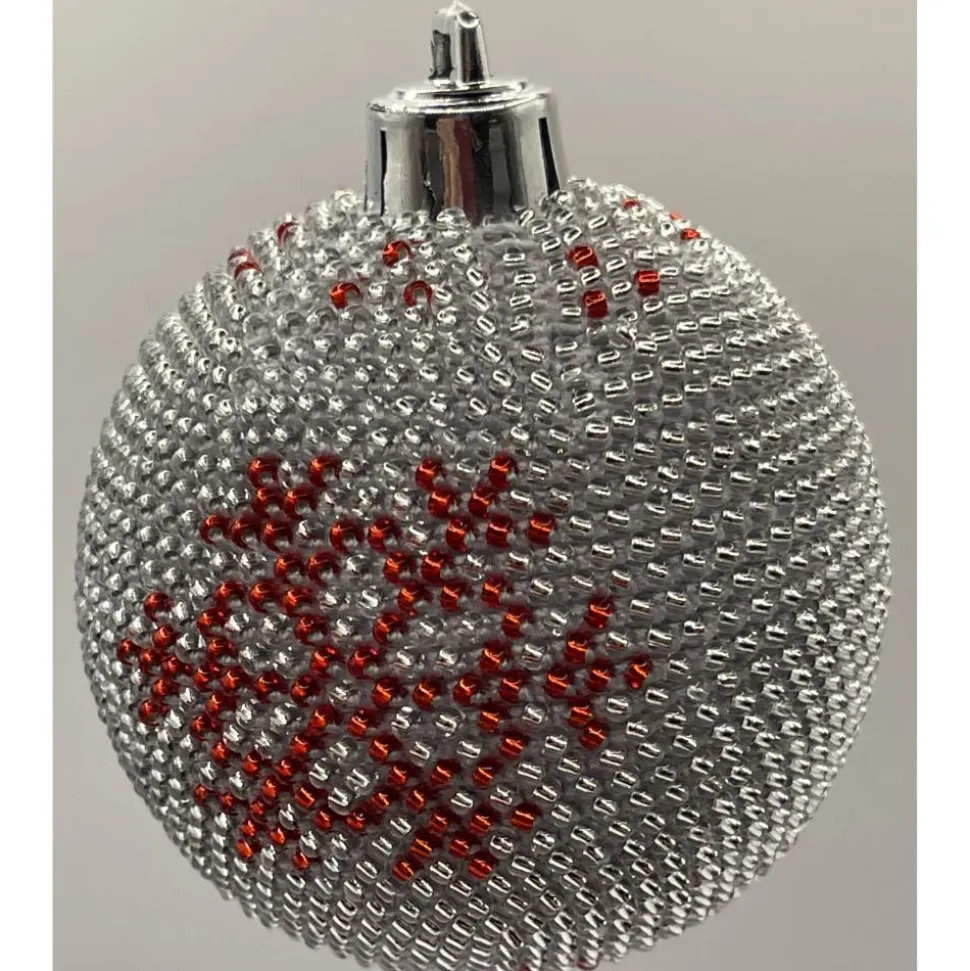Es werden Kunststoff Weihnachtskugeln mit aufgefädelten Glasperlen umhäkelt.