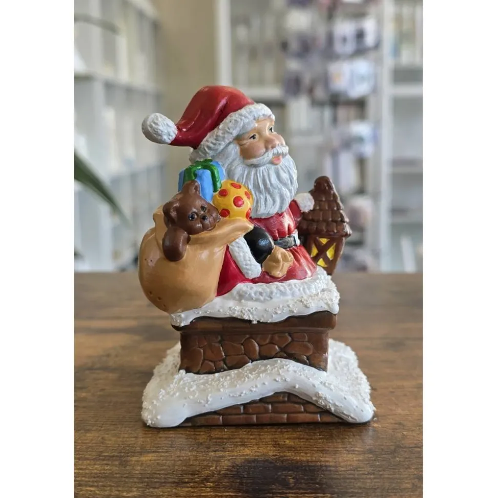 Die Figur ist aus Keramik gefertigt, handbemalt und zeigt einen Weihnachtsmann mit einer Laterne und Geschenken.
