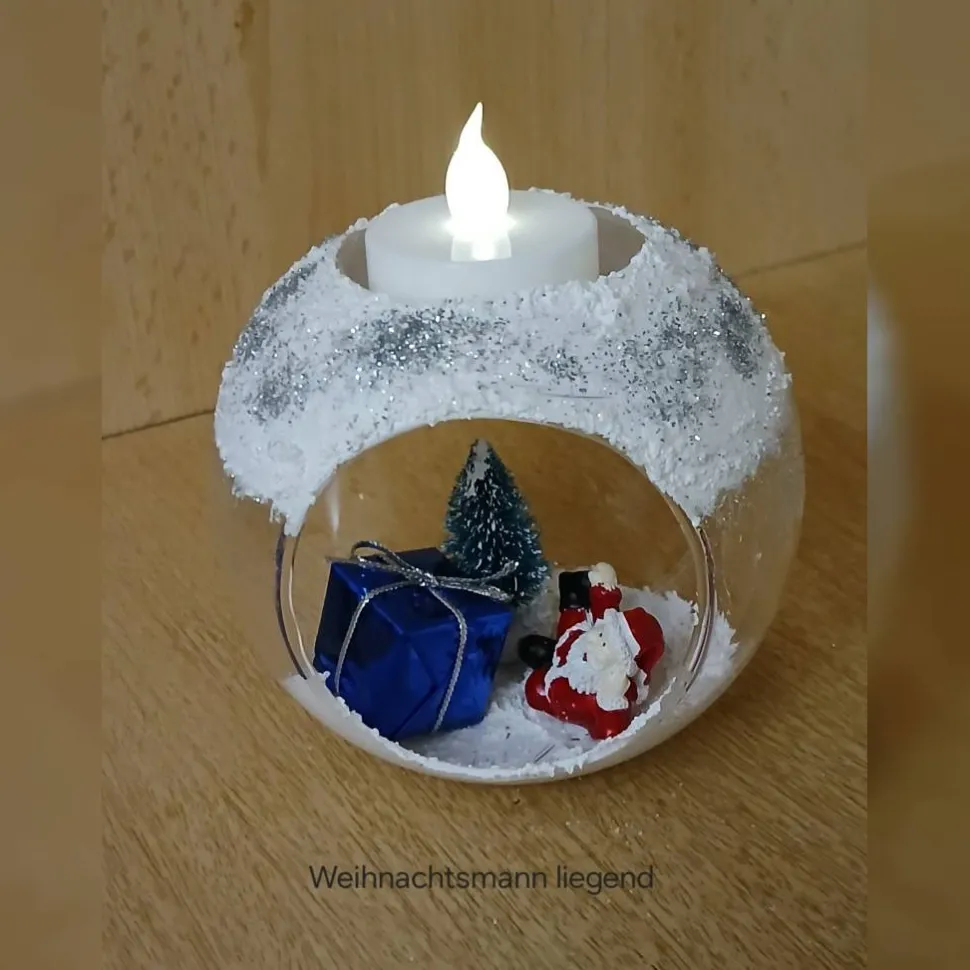 Im oberen Bereich des Glases befindet sich eine praktische Vertiefung, in die das beiliegende Teelicht eingesetzt werden kann. Sobald die Kerze entzündet wird, taucht ihr warmer Schein die Weihnachtslandschaft in ein sanftes, gemütliches Licht. Das flackernde Kerzenlicht bringt die Figur des Weihnachtsmanns und die verschneiten Details besonders schön zur Geltung und schafft eine behagliche Atmosphäre, die zum Verweilen und Genießen einlädt.