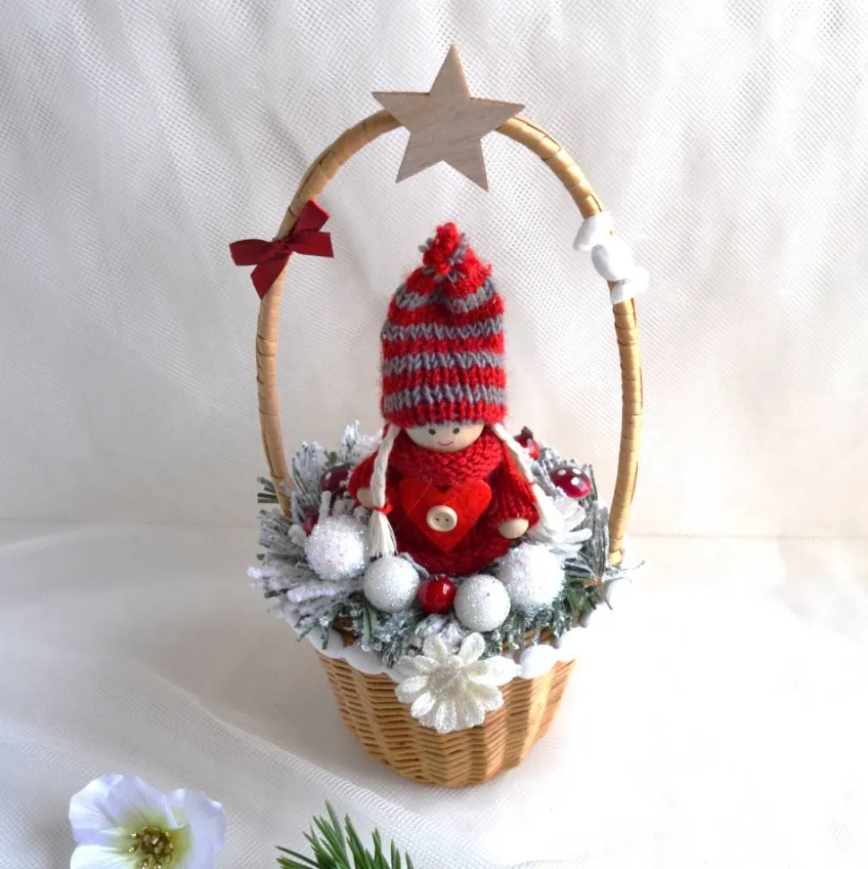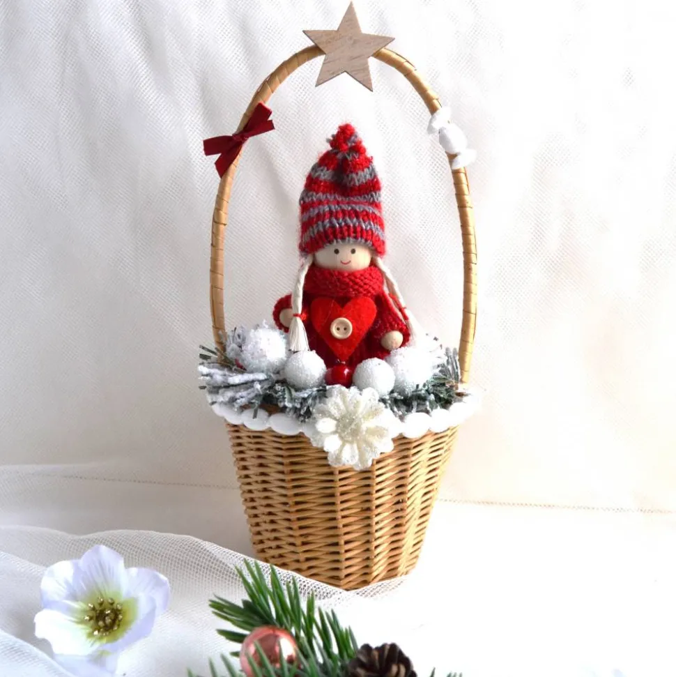 Material: Baumwolle, Holz, Korb, Satinschleife, Dekoteile, Kunsttanne