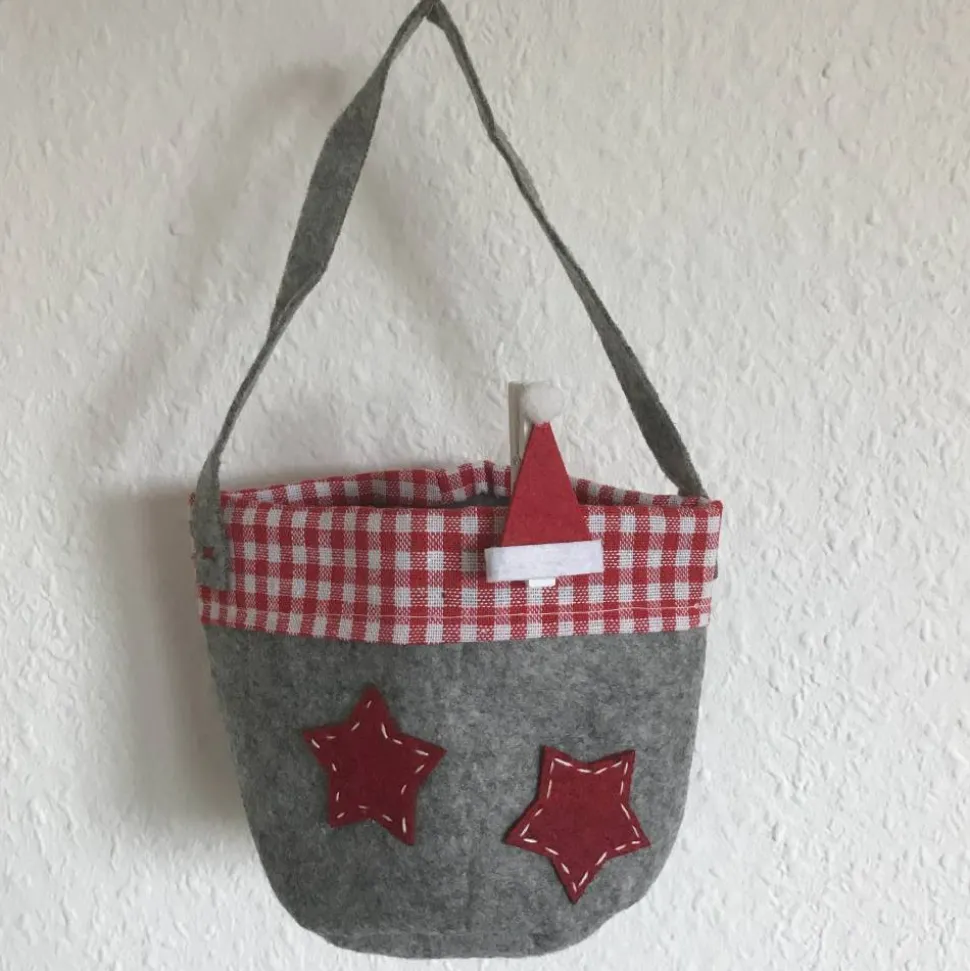 – runder Filzbeutel mit kariertem Rand und Stern-Applikationen, Farbe: grau/dunkelrot; Höhe: 10 cm, Durchmesser: 10 cm, Material: Filz; Höhe mit Griff: 22 cm