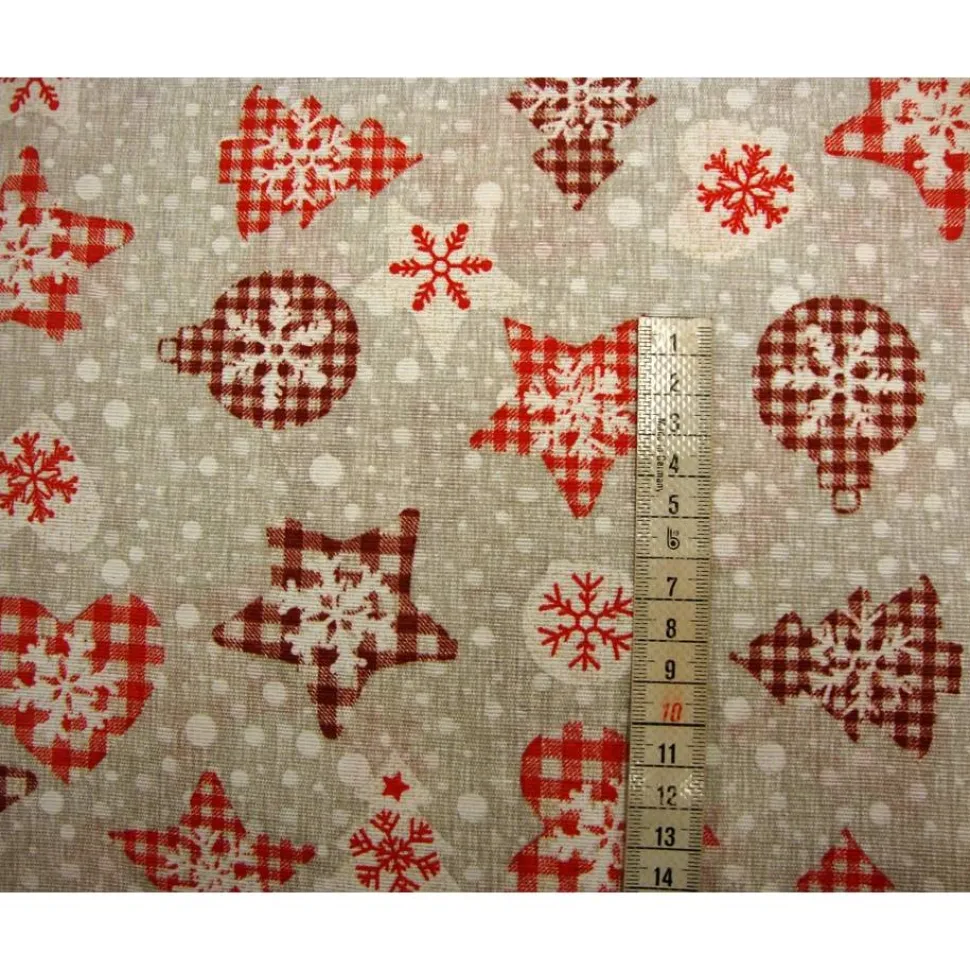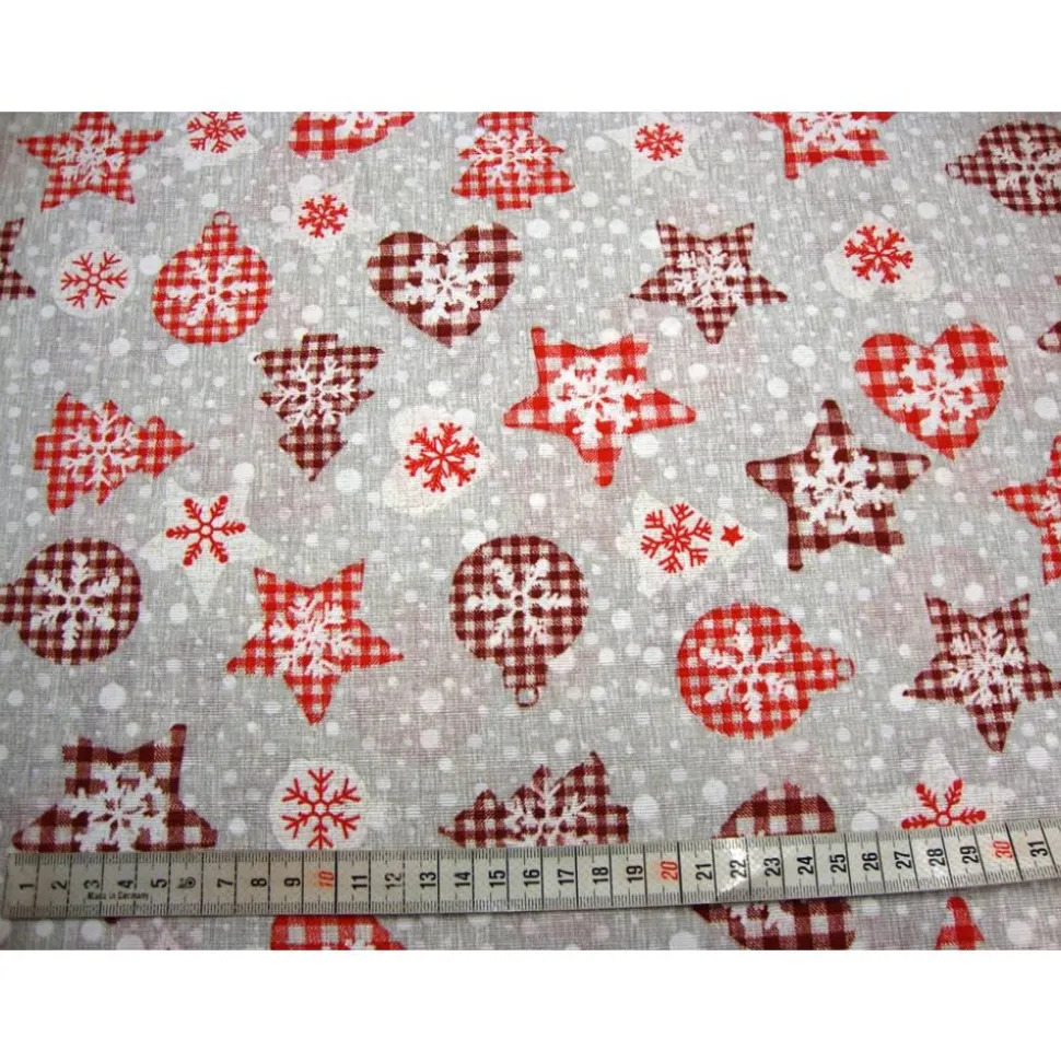 Der Deko-Stoff begeistert mit klassischen Weihnachtsmotiven wie Sterne, Tannenbaum, Herzen und Kugeln im angesagten Karomuster auf grauem Grund.