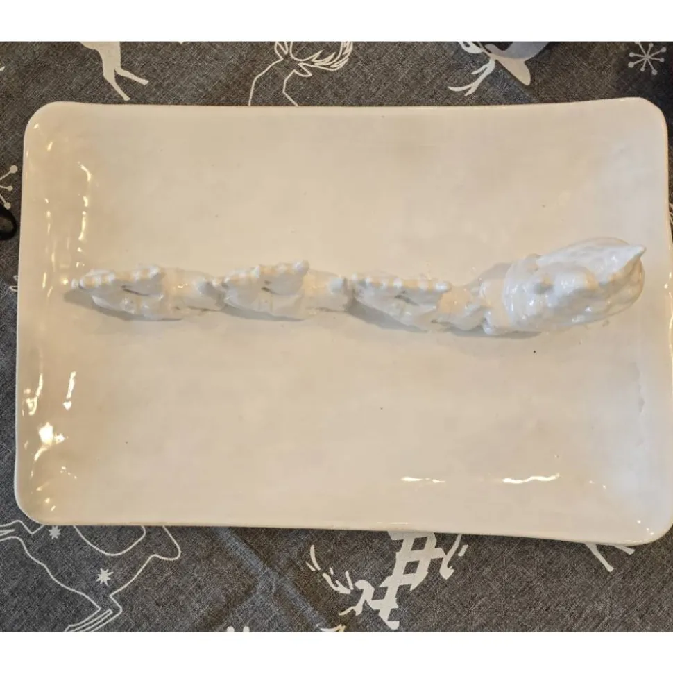 Der Teller ist aus Keramik handgefertigt und hat eine Länge von etwa 28,0 cm, eine Breite von 19,0 cm und eine Höhe von 7,5 cm.