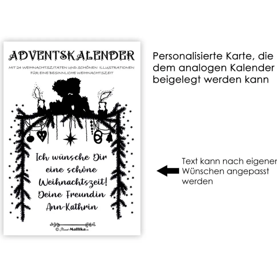 B) Beim analogen, fertig gestalteten Adventskalender bekommst Du bereits geschnittene, gerollte Botschaften, die in einer Pergamin-Tüte schön verpackt sind. Der Kaufpreis für diese Ausführung beinhaltet auch die Versandkosten. Auf Wunsch kann auch eine personalisierte Karte mit Deinem Wunschtext beigelegt werden (s. Artikelbilder).