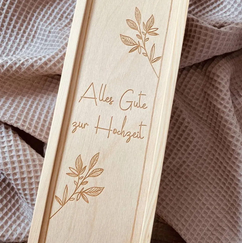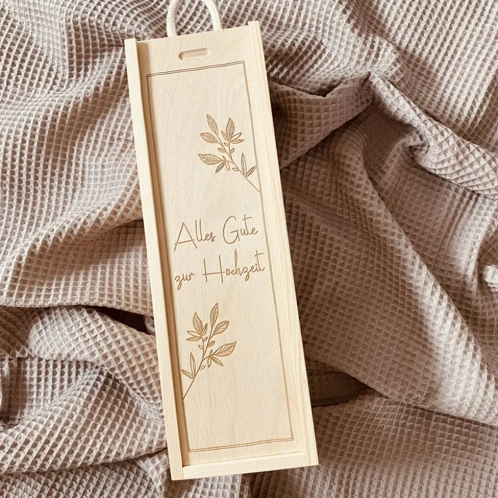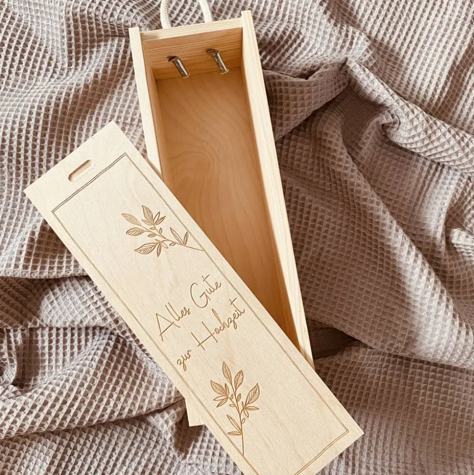 *Die Weinflasche und Dekoration sind nicht mit in der Lieferung enthalten. Es wird nur die gravierte Weinkiste geliefert.*
