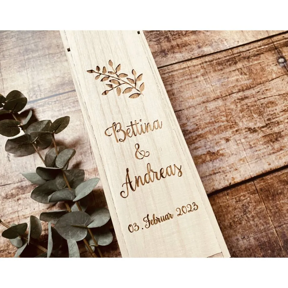 *Die Weinflasche und Dekoration sind nicht mit in der Lieferung enthalten. Es wird nur die gravierte Weinkiste geliefert.*