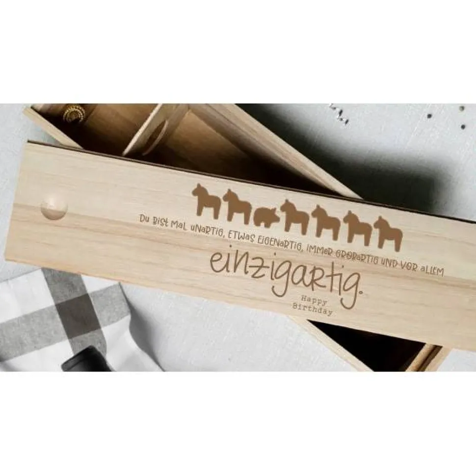 *Die Weinflasche und Dekoration sind nicht mit in der Lieferung enthalten. Es wird nur die gravierte Weinkiste geliefert.*