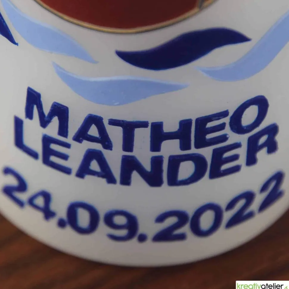 Auch die Beschriftung erfolgt mit echten Wachsbuchstaben. Im Preis enthalten sind maximal 2 Vornamen und ein Datum bestehend 6 Ziffern (z.B. 22.10.23).