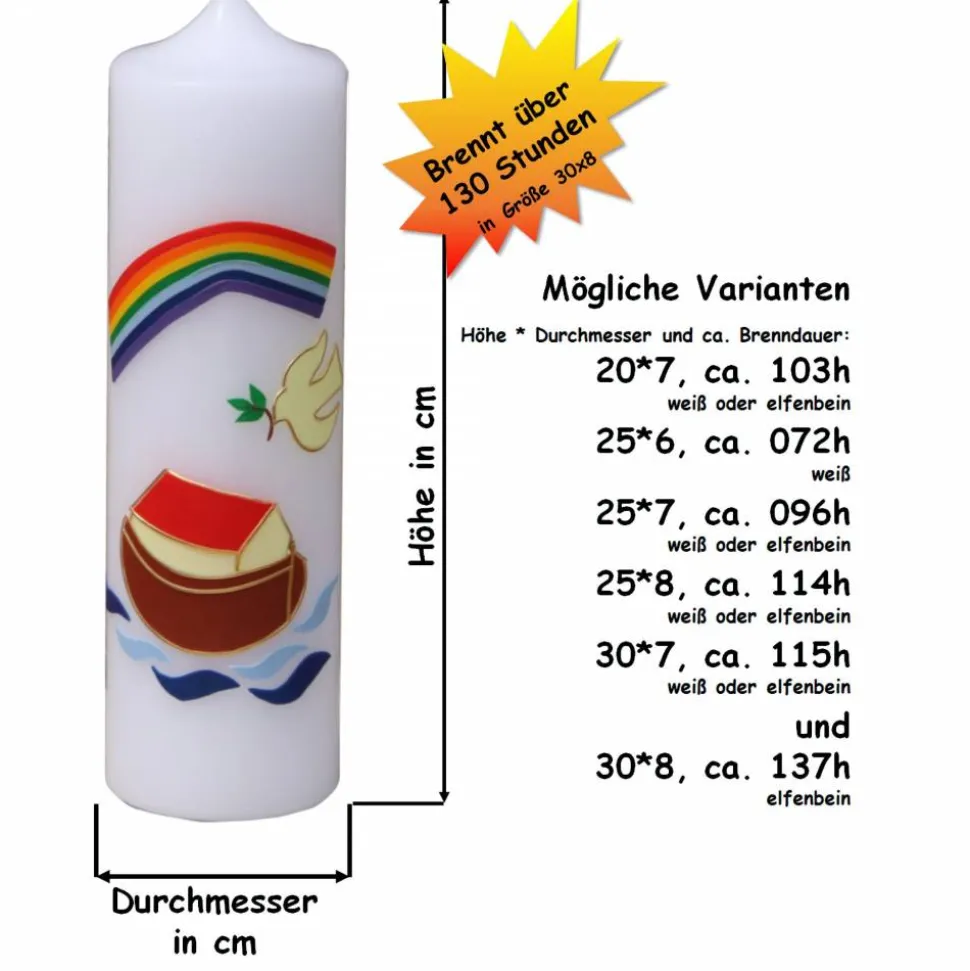 Die Arche Noah auf der Kerze steht für Rettung und Schutz und verleiht ihr eine hoffnungsvolle Ausstrahlung. Das Wasser mit dem Regenbogen, das die Arche umgibt, symbolisiert das heilige Ritual der Taufe und die Reinigung des Geistes und der Seele. Die Taube mit dem Zweig neben der Arche betont die Bedeutung von Frieden und Hoffnung und verleiht der Kerze eine spirituelle Bedeutung.