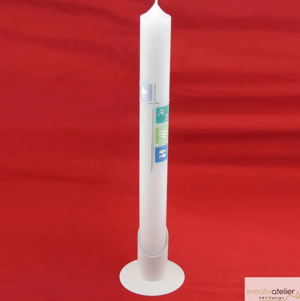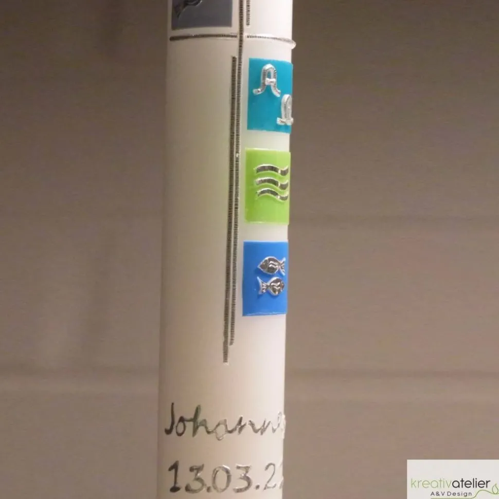 Die Symbolde auf der Taufkerze sind Alpha und Omega, eine Taube, Wasser und Fische. Jede Kachel ist sorgfältig gestaltet und fügt sich harmonisch in das Gesamtbild der Kerze ein, um eine festliche und bedeutungsvolle Atmosphäre zu schaffen.