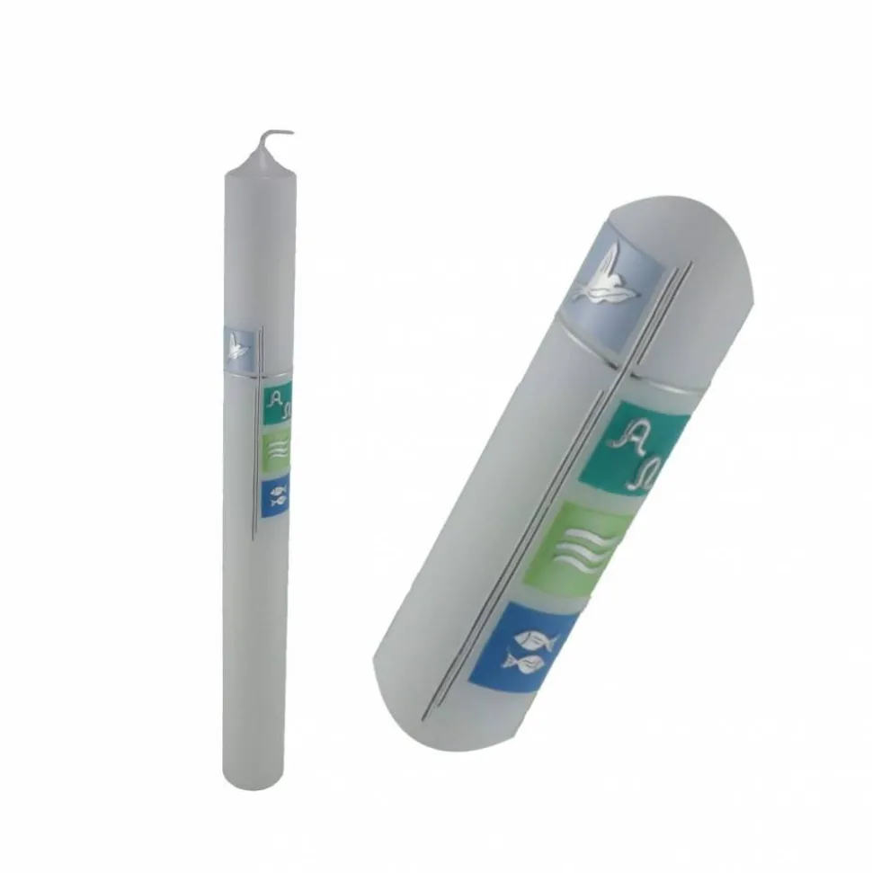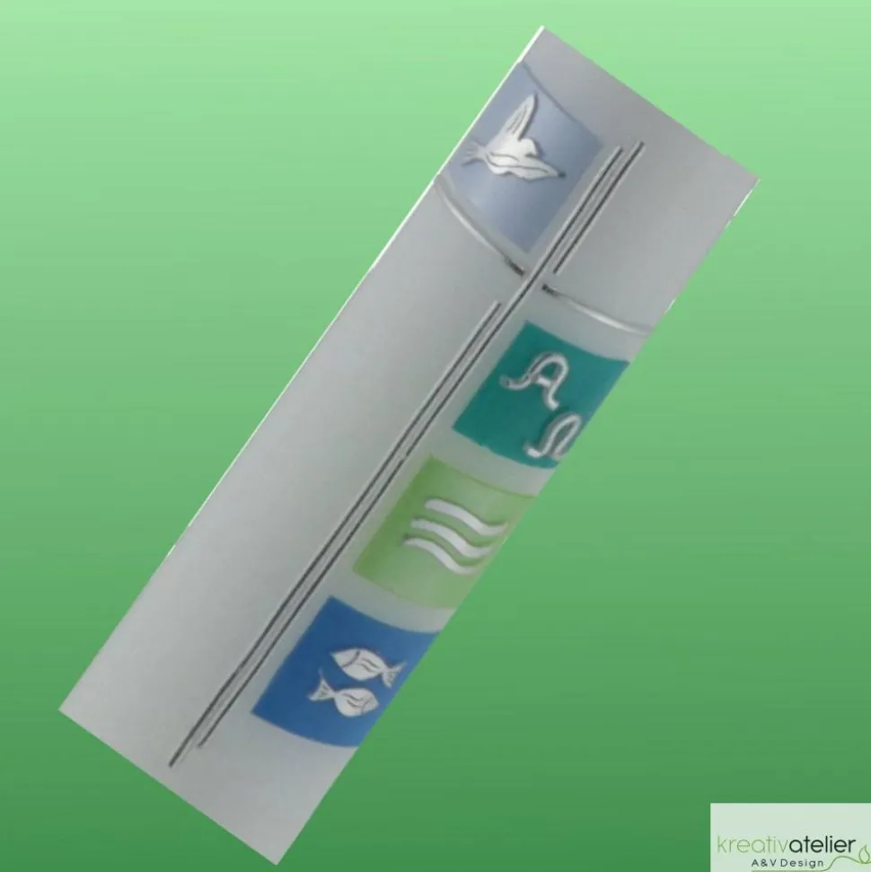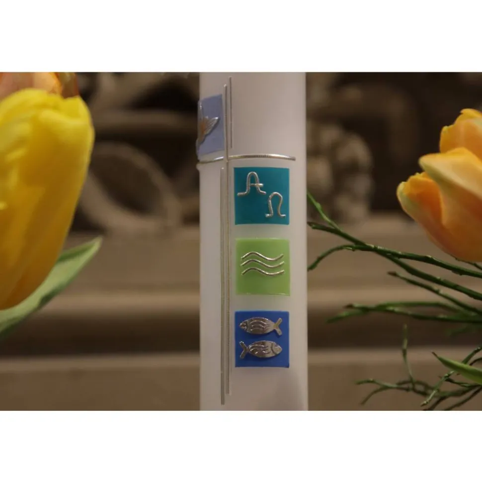 Liebevoll von Hand verzierte, aufwändige, weiße Taufkerze mit vier Kacheln in verschiedenen Blau- und Grüntönen, die die christlichen Symbole in silber zeigen. Alle Ornamente werden einzeln von Hand aus verschiedenen Wachsplatten ausgeschnitten, bevor sie kunstvoll auf der Kerze zu einem Gesamtbild arrangiert werden.