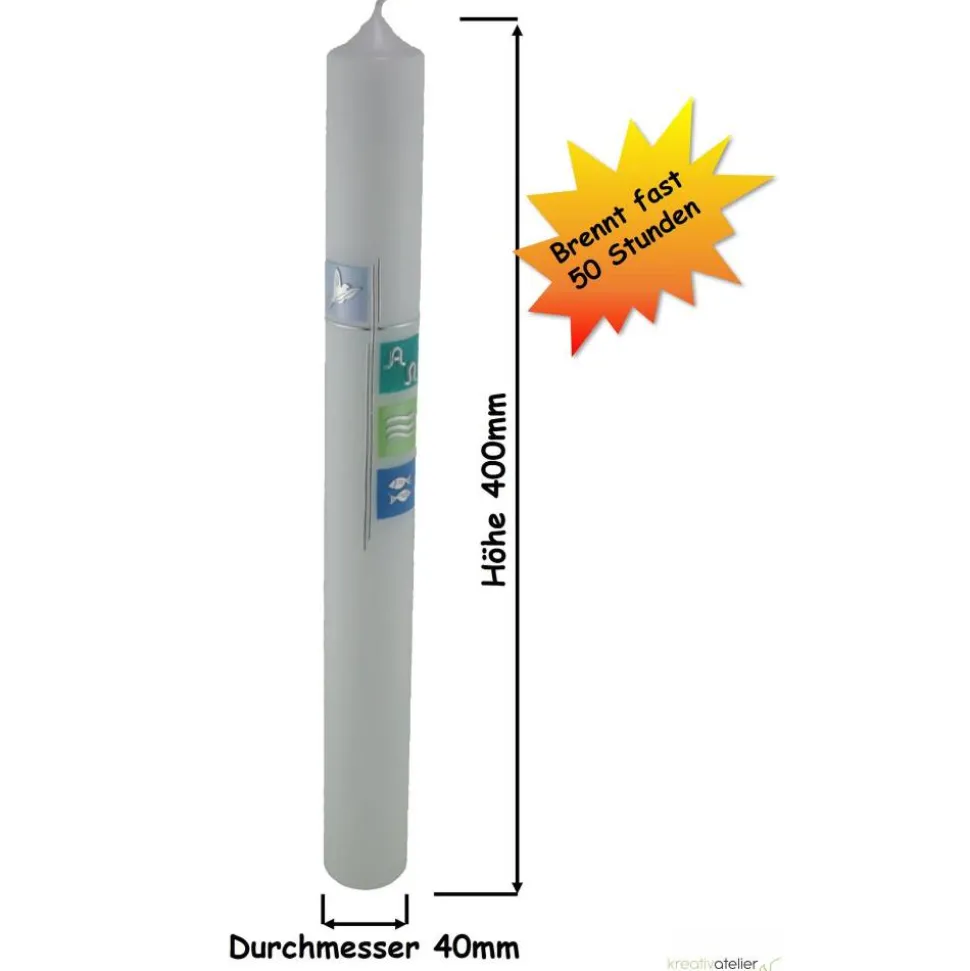 Die Taufkerze eignet sich sehr gut zur weiteren Verwendung als Kommunionkerze. Diese Taufkerze wird in meinem Atelier individuell für Sie gefertigt. Als Rohling verwende ich ausschließlich Qualitätskerzen, die in Deutschland nach traditionellen Verfahren gezogen werden. Diese Taufkerze brennt ca. 48 Stunden.