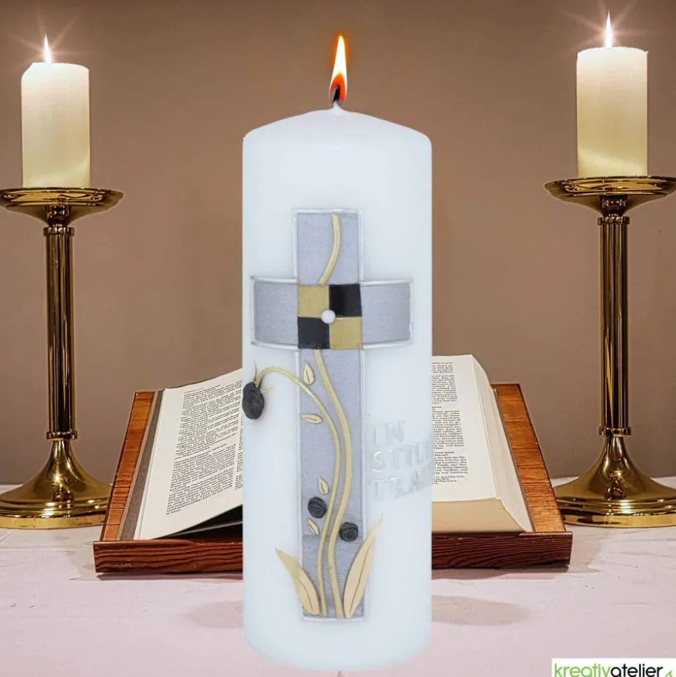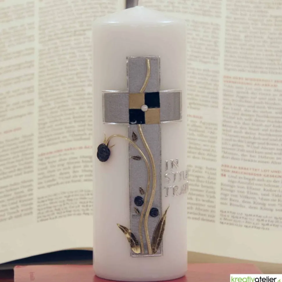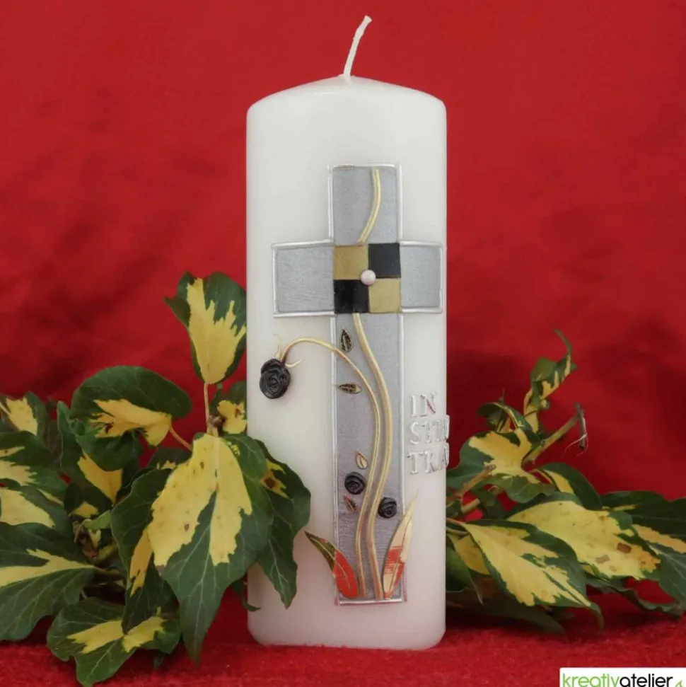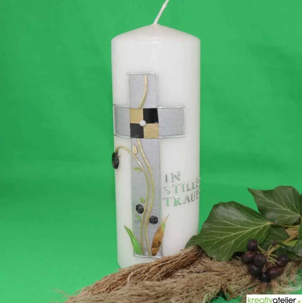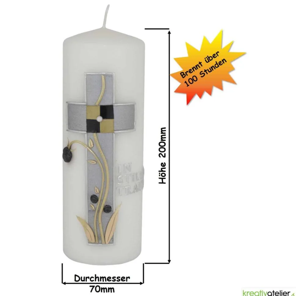 Eine Trauerkerze ist ein würdevolles und edles Andenken an einen verstorbenen Menschen. Die Trauerkerze „In stiller Trauer“ mit Kreuz, silber-gold verziert, ist eine besonders stilvolle Variante.
