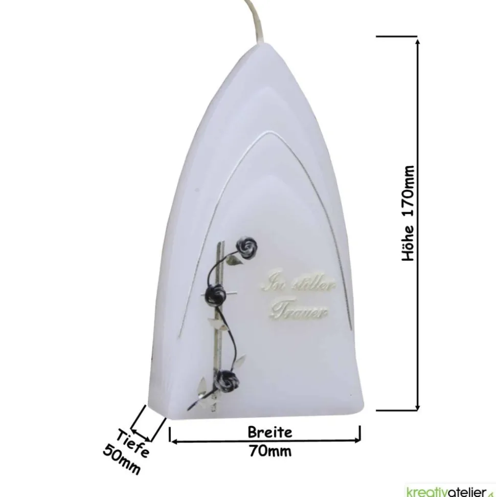 Das antiksilberne Kreuz bildet den dezenten Hintergrund für die Rosenranke aus schwarz-silbernen Rosen. Die Kombination dieser Symbole auf der Trauerkerze schafft eine ruhige und besinnliche Atmosphäre, die zum Gedenken und zur Trauerbewältigung beitragen kann. Eine stilvolle Ergänzung zum Kreuz bildet der Schriftzug „In stiller Trauer“ aus Echtwachs.