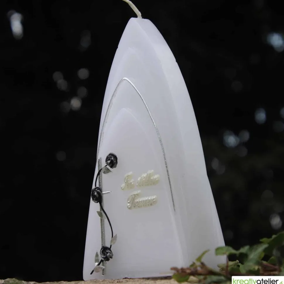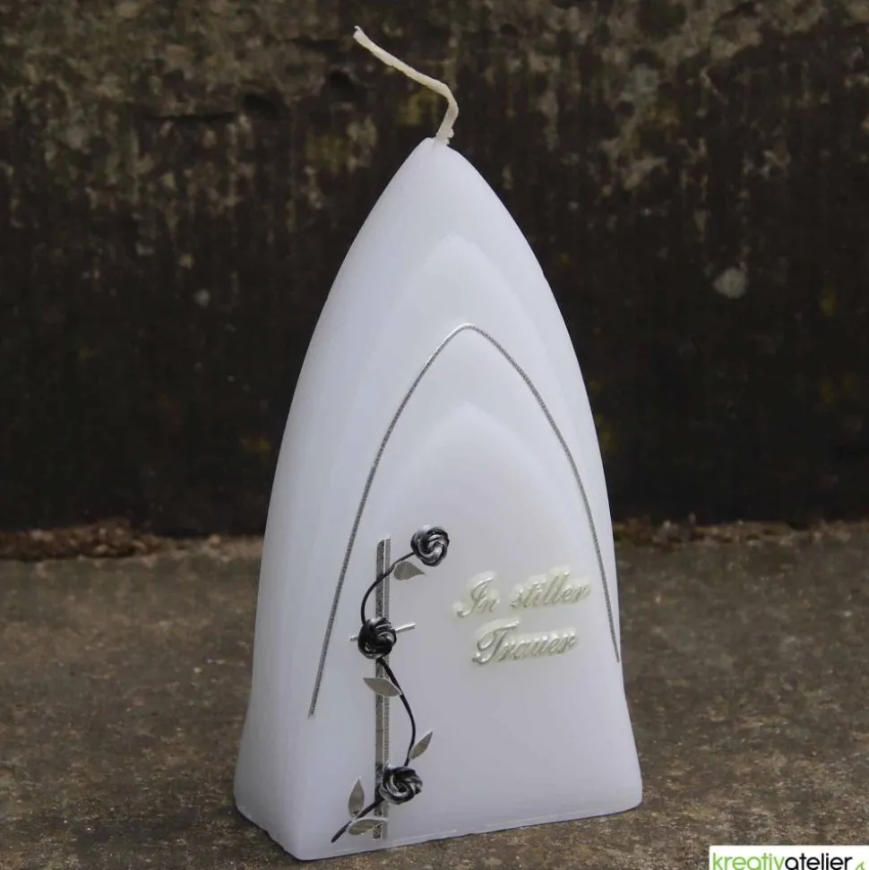 Diese moderne Trauerkerze ist ein stilvolles und edles Accessoire, um in stiller Trauer Abschied von einem geliebten Menschen zu nehmen. Die Gedenkkerze ist von Hand mit echtem Wachs verziert und personalisierbar.