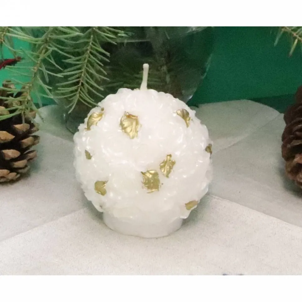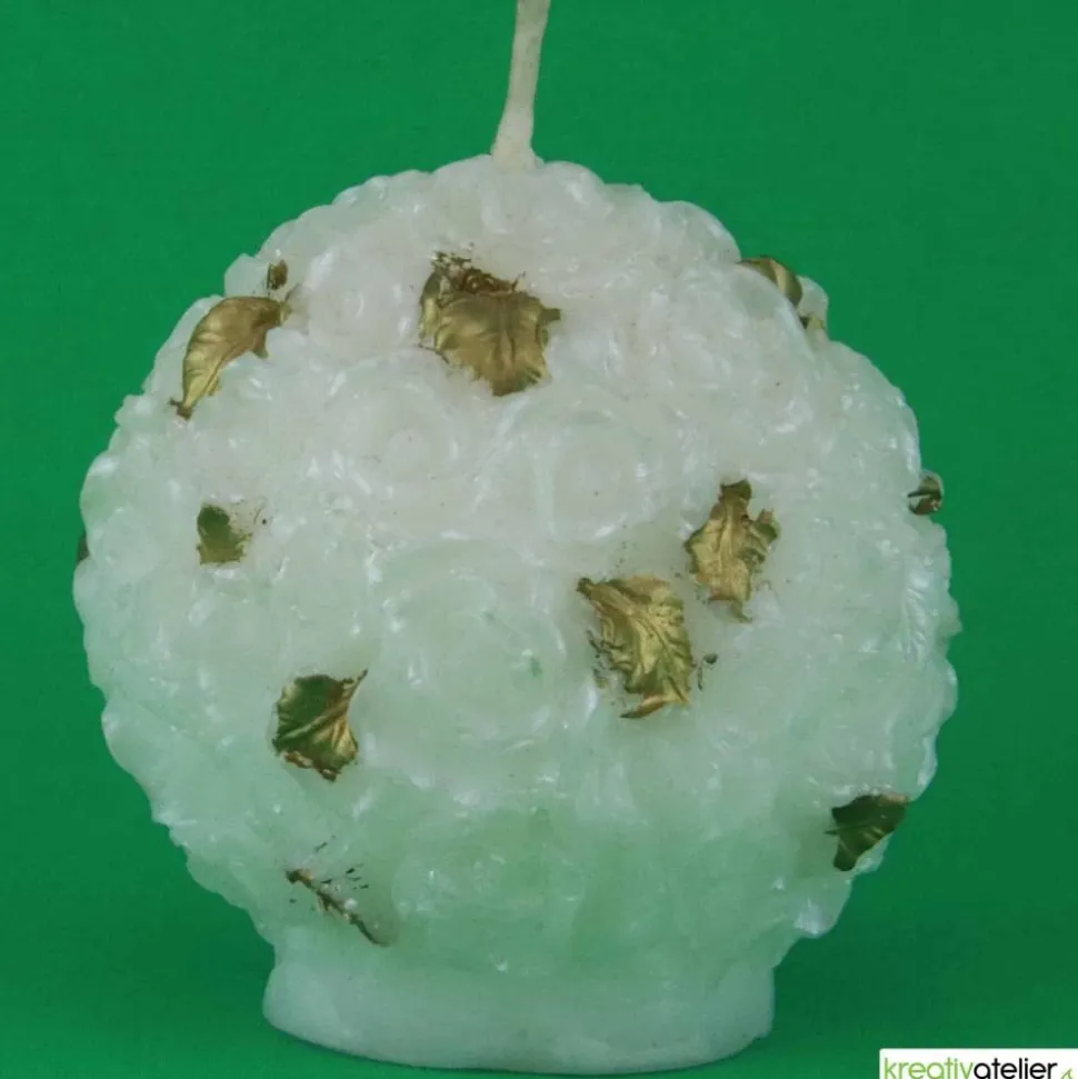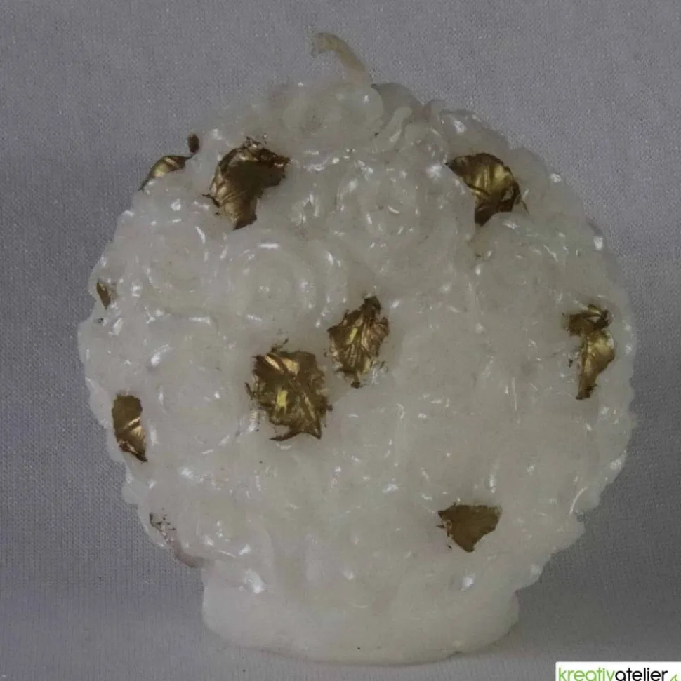 Diese Formenkerze wurde von Hand gestaltet. Die Oberfläche bilden eine Vielzahl von zarten Rosen. Zwischen den Rosenblüten sind kleine goldfarbige Blätter, die der Kerze ihr edles Aussehen geben. Die Weihnachtskerze ist ca. 70 mm im Durchmesser. Durch den kleinen Absatz am unteren Rand ist die Kerze sehr gut geeignet für Advent- und Weihnachtsgestecke.