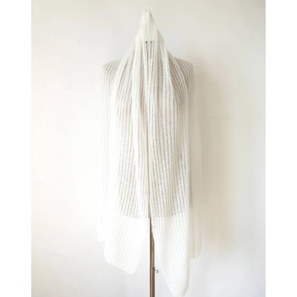 Der minimalistische Schal ist in Feinstrick gefertigt und hat an beiden Endkanten kleine Zähnchen-artige Häkelbordüren.
