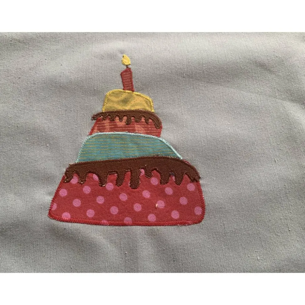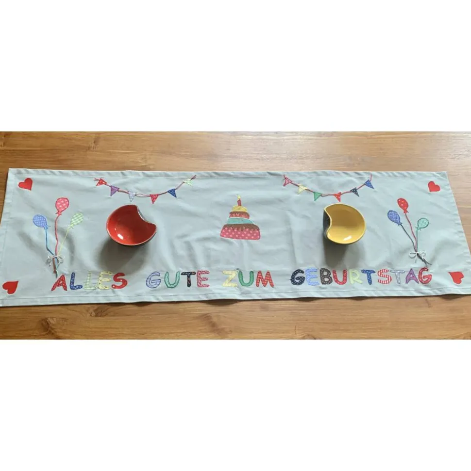 Aufwendig gearbeiteter Tischläufer für den Geburtstagtisch mit zahlreichen fröhlich-bunten und handgefertigten Applikationen.