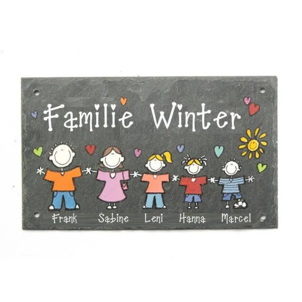 Gestalte deinen Eingangsbereich individuell mit einem personalisierten Türschild aus hochwertigem Schiefer. Jedes Schild wird handgefertigt und mit deinem Familiennamen sowie bis zu sechs Figuren nach Wunsch bemalt. Unter den Figuren werden die Vornamen ergänzt, bunte Herzen und eine Sonne setzen liebevolle Akzente.