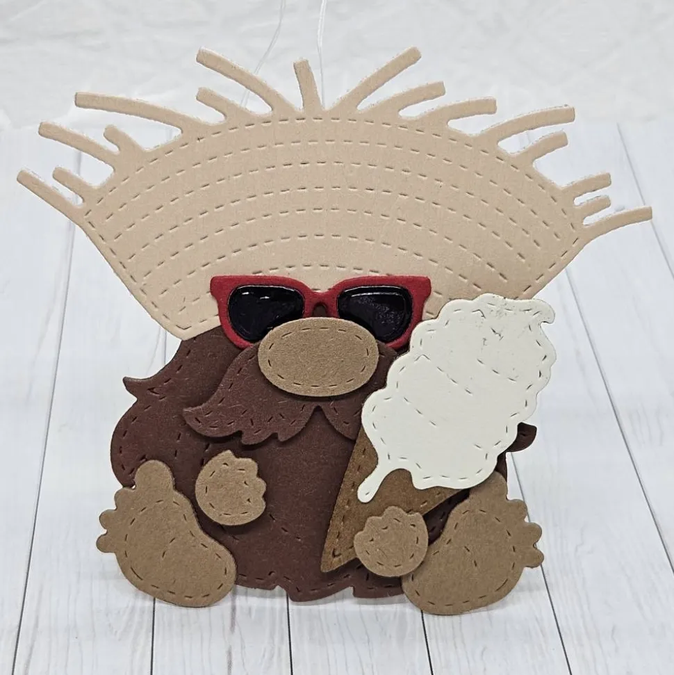 Dieser fröhliche Wichtel auf Urlaubsabenteuer verbreitet pure Sommerlaune! Mit seinem breiten Strohhut, der stylischen Sonnenbrille und einem leckeren Eis in der Hand genießt er das Leben in vollen Zügen. Neben ihm liegen ein bunter Wasserball und ein aufblasbarer Flamingo-Schwimmreifen, die für echtes Urlaubsfeeling sorgen.