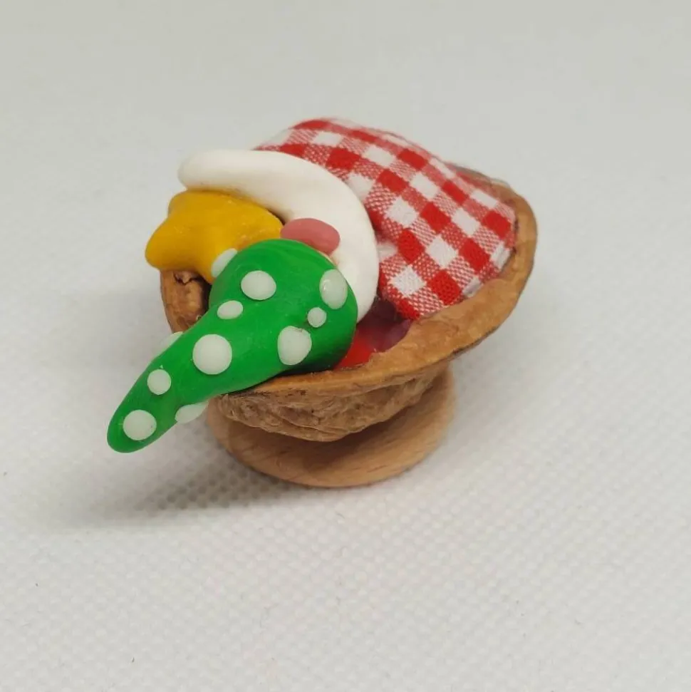 Ein zauberhaftes Unikat für deine Weihnachtsdeko: In einer echten Walnussschale schläft ein kleiner Wichtel mit grüner Zipfelmütze mit nachtleuchtenden Punkten aus Polymer Clay und kuschelt unter einem handgenähten rot/weiß kariertem Kissen gemütliche mit einem goldigen Stern.