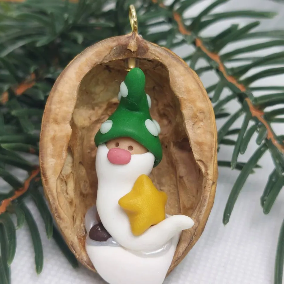 Dieser liebevoll von Hand gefertigte Weihnachtsanhänger ist ein zauberhaftes Unikat. In einer echten Walnussschale sitzt ein kleiner Wichtel aus Polymer Clay, detailreich modelliert mit weißem Bart, grüner Mütze und einem kleinen Stern – ein weihnachtliches Symbol für Licht, Hoffnung und festliche Magie.