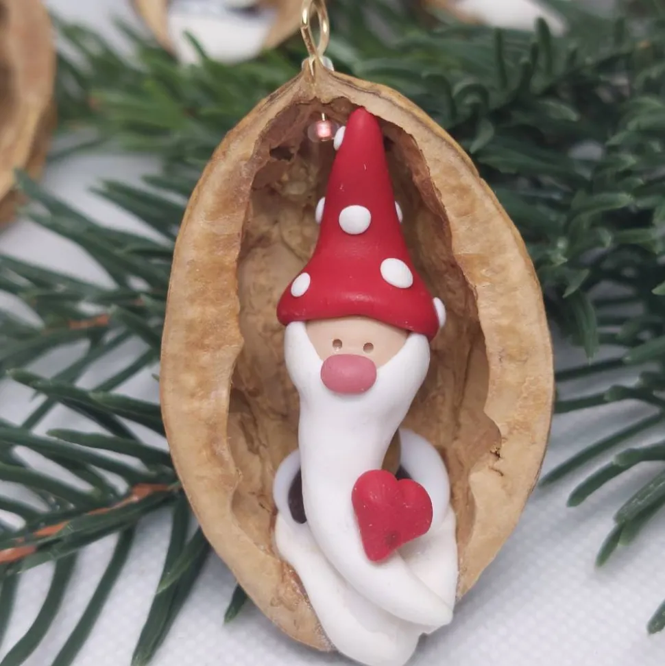 Dieser liebevoll von Hand gefertigte Weihnachtsanhänger ist ein echter Blickfang für deinen Baum, Adventsstrauß oder als kleine Geschenkidee. In einer echten Walnussschale sitzt ein zauberhafter kleiner Wichtel aus Polymer Clay, liebevoll modelliert mit weißem Bart, roter Zipfelmütze mit weißen Punkten verziert und einem roten Herzchen – ein Symbol für Wärme, Freude und weihnachtliche Gemütlichkeit.