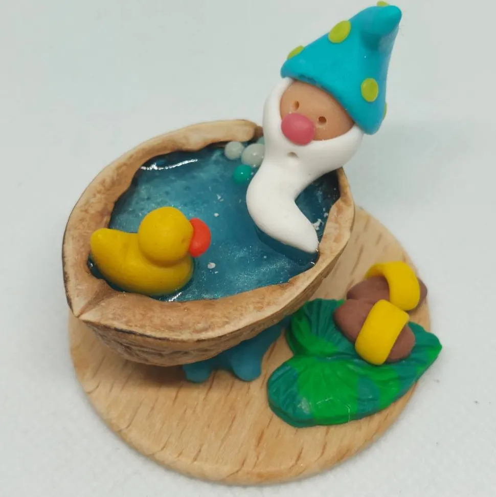 Diese liebevoll handgefertigte Miniatur zeigt einen fröhlichen kleinen Wichtel, der ein entspannendes Bad in einer Walnussschale genießt. Mit seiner hellblauen Zipfelmütze die mit gelben Punkten verziert ist, dem langem weißen Bart und einem gelben Quietscheentchen an seiner Seite verbreitet er sofort gute Laune. Die Walnussschale ist mit türkis glitzenden Epoxidharz gefüllt, das wie schimmerndes Wasser wirkt. Auf einer kleinen Holzplatte arrangiert, komplettieren ein blattförmige Badematte in Grüntönen , sowie passenden kleinen Badelatschen in gelb das charmante Szenenbild.
